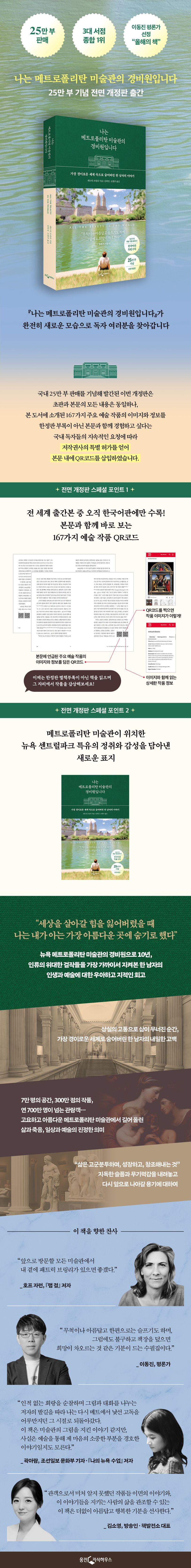 2023년 초판 출간 이래 독자들의 뜨거운 사랑을 받은 에세이 『나는 메트로폴리탄 미술관의 경비원입니다』가 ‘25만 부 기념 전면 개정판’으로 새롭게 태어났다. 2024년 새해 벽두부터 한국 사회에 ‘메트로폴리탄 미술관 열풍’을 불러일으킨 지 1년 9개월 만이다.