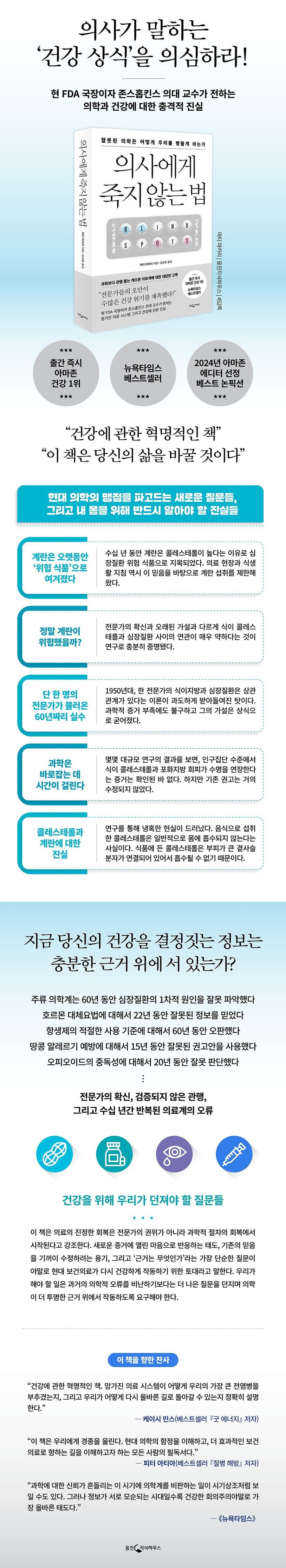 마티 마카리 박사는 『의사에게 죽지 않는다』를 통해 의료진의 잘못된 판단과 과학적 근거의 불충분, 관료적인 집단주의가 얽히고설켜 얼마나 많은 사람이 진실에서 빗겨 서 있는지 알리고자 한다. 이 책은 출간 즉시 미국을 발칵 뒤집었다. 뉴욕타임스 베스트셀러, 아마존 건강 분야 1위를 기록하며 베스트 논픽션에 선정되었고, “현대 의학의 가장 위험한 맹점을 파헤친 책”이라는 찬사를 받았다. 의료 생태계에서 작동하는 ‘보이지 않는 위험 지대’를 폭로하며 환자와 의료계 모두가 더 나은 선택을 하도록 이끄는 안내서이자, 지금 당신이 믿는 불확실한 ‘건강 상식’을 바로잡을 기회를 제공해줄 것이다.