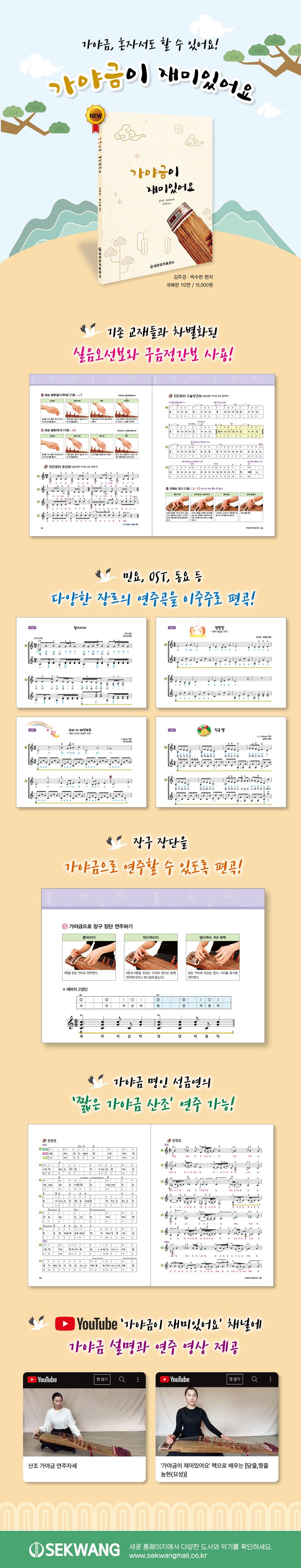 민요, OST, 동요 등 다양한 장르의 곡들을 이중주로 편곡하여 다른 사람들과 화음을 맞추어 연주할 수도 있습니다. 또한 유튜브 ‘가야금이 재미있어요’ 채널에 가야금 설명과 연주 영상을 제공하여 혼자서도 가야금을 배울 수 있게 구성하였습니다. 어렵게 느껴졌던 가야금에 한걸음 더 가까이 다가갈 수 있는 기회가 될 것입니다.
