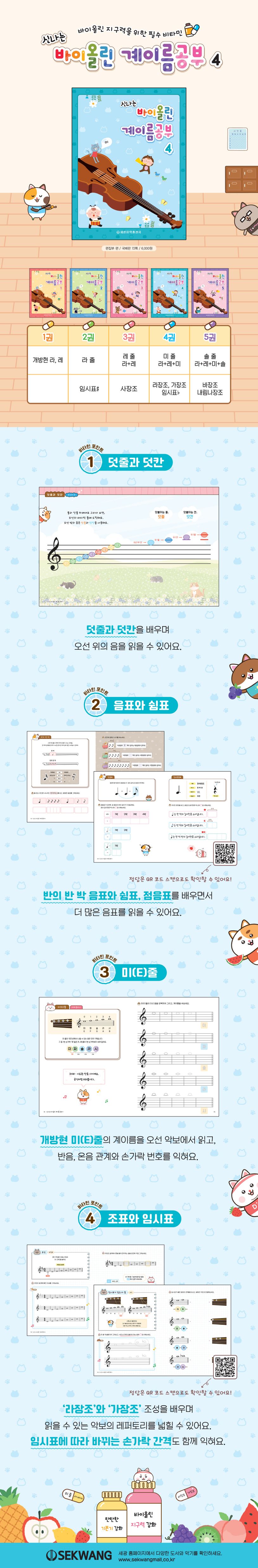 ★ 바이올린을 처음 배우는 아이들이 악보를 쉽게 읽을 수 있도록 각 권마다 바이올린 줄별로 계이름을 익힐 수 있습니다. 4권에서는 미(E)줄의 계이름을 배울 수 있습니다.