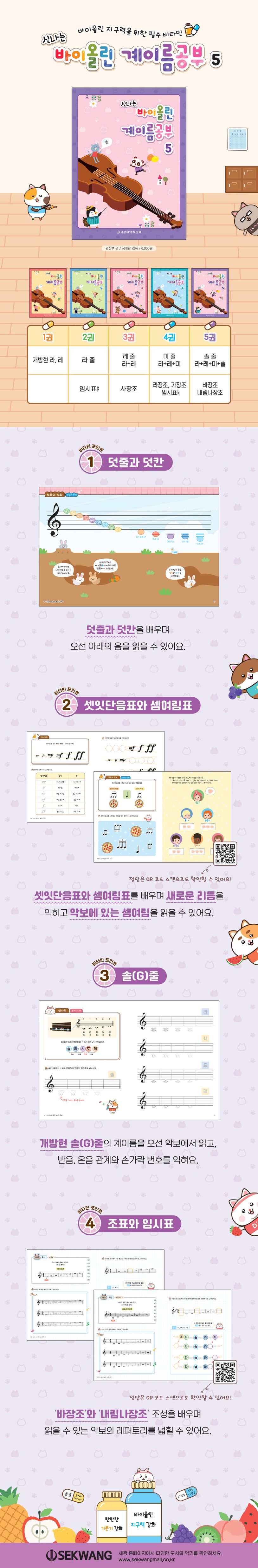 ★ 1권 - 오선악보에서의 개방현 라, 레, 2권 - 라(A)줄, 3권 - 레(D)줄, 4권 - 미(E)줄, 5권 - 솔(G)줄의 계이름을 배울 수 있습니다.