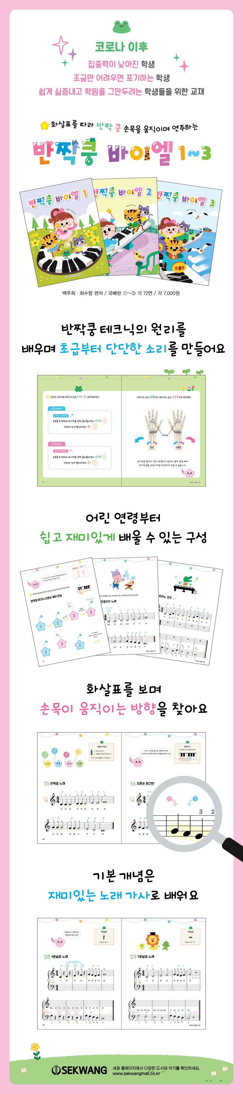1. 현재 학원 실정에 맞는 3권으로 구성된 바이엘로 초급 단계에서 재미있게 꾸준히 배울 수 있는 쉬운 기초 교재입니다.