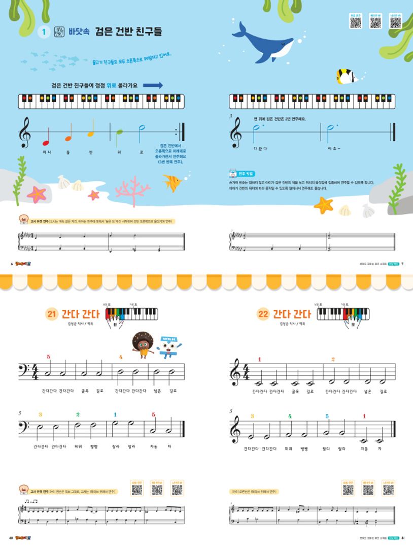 3. 아이들에게 친숙한 곡들을 담았으며, 곡마다 선생님 반주와 QR 반주 음원을 수록하여 반주에 맞춰 연주하거나 선생님과 학생이 함께 연주할 수 있도록 했습니다.