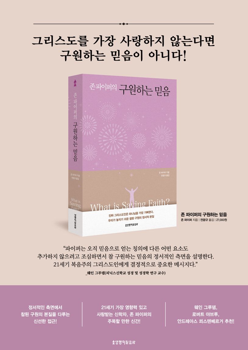 존 파이퍼는 조나단 에드워즈, 헨리 스쿠걸, 존 오웬, 웨인 그루뎀, J. I. 패커, 존 맥아더 등 신학자들의 구원에 관한 통찰을 존중하면서, 우리가 오해하기 쉬운 기독교 신앙에 관해 탐구하고, 신자들에게 중요한 질문을 던진다. 구원하는 믿음의 목표는 결국 우리가 하나님께 가장 만족함으로써 하나님을 영원히 영화롭게 하는 것이다.