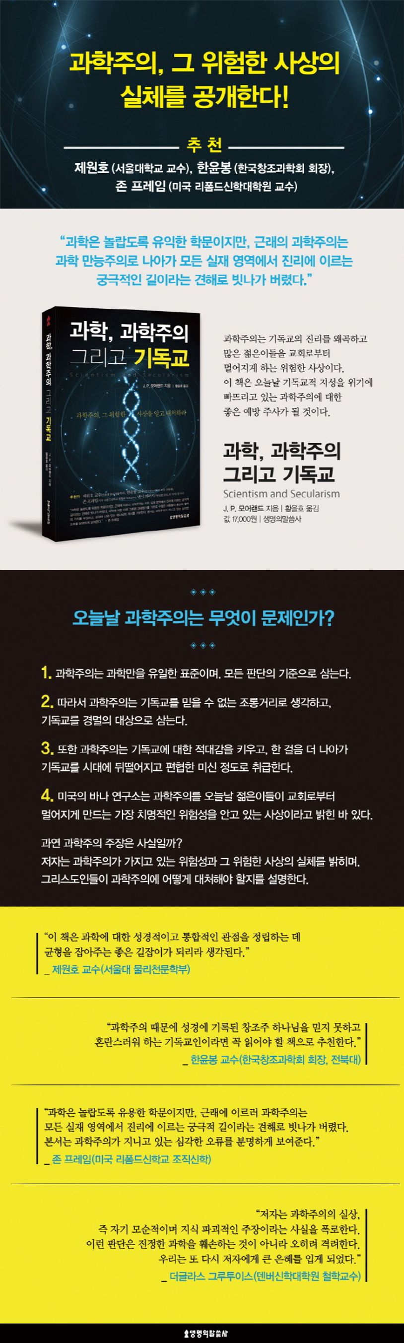 “과학은 놀랍도록 유용한 학문이지만, 근래에 이르러 과학주의는 모든 실재 영역에서 진리에 이르는 궁극적 길이라는 견해로 빗나가 버렸다. 과학에 대한 이런 그릇된 과대평가를 기초로 수많은 사람들이 종교와 철학의 가치를 부정하고, 성경에 나와 있는 하나님의 계시를 거부한다. 본서는 과학주의가 지니고 있는 심각한 오류를 분명하게 보여준다.” - 존 프레임