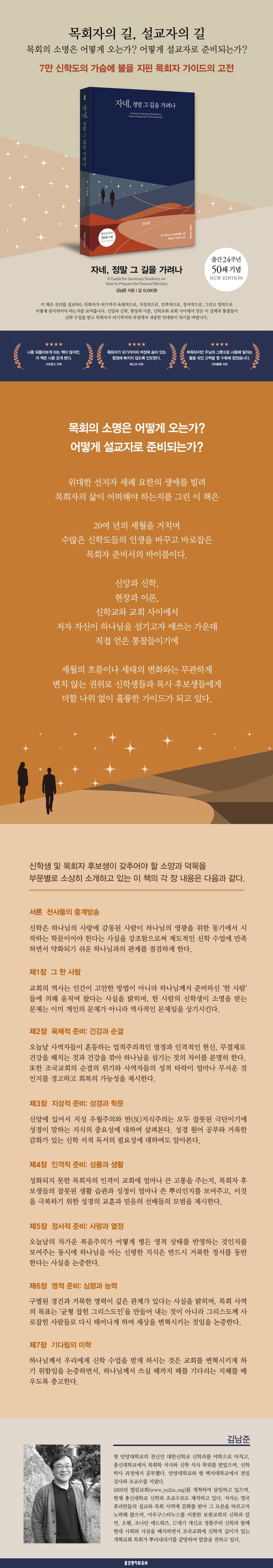 걸어갈수있는길이수없이많음에도불구하고사는날동안무거운짐과뜨거운고난을짊어져야하는길을선택하는것을필연으로느끼는사람들이있다.바로목회의길을가려는사람들이다.자신의전존재와자기의모든소유를하나님께드리기를아까워하지않으면서자신을위해서는아무것도취하지않는거룩한정서에불붙은사람들이바로그들이다.특별한하나님의도구이자세상과교회의거룩한인도자가되는이길은어떤길인가?그길을가기위해어떤준비를해야하며,또어떻게그길을걸을것인가?