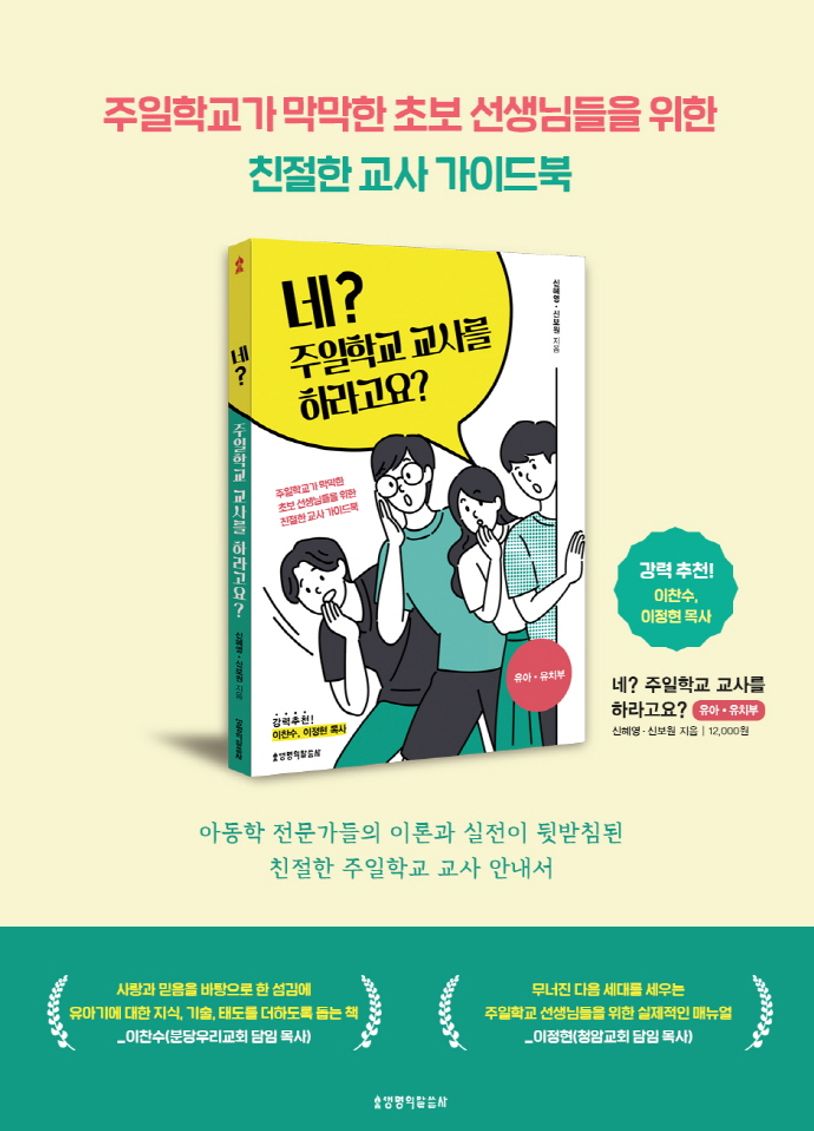 주일학교가막막한초보선생님과행복한주일학교교사를꿈꾸는선생님을위한리얼현장가이드북아동학전문가들의이론과실전이뒷받침된친절한주일학교교사안내서“주일학교교사,같이해보실래요?”교회의성도라면누구나한번쯤들었을법한제안에믿음(?)으로헌신은했지만막상아이들을맞이하는당일,어떤것부터해야할지몰라막막하고안타까웠던적은없었는지요?『네?주일학교교사를하라고요?』는아이들을더잘사랑하고섬기고싶지만방법을알지못해토요일밤마다마음에부담을느끼는주일학교선생님을위해만들어졌습니다.이시리즈의첫번째책은유아유치부편입니다.유아유치부는주일학교부서중에서가장중요하다고해도과언이아닐정도이며다음세대사역의모판이라고불리기도합니다.유아유치부에서아이들을잘키워올려보내줘야주일학교전체가튼튼해지기때문입니다.이책에서는다양한유아교육현장과주일학교에서발로뛰며내공을쌓아온두아동학박사가친절하고현실감있게유아유치부의현장예배및활동상황을코치해주고있습니다.주일학교에서아이들을처음맞이하는법,신나게찬양하는법,예배시간에집중하도록돕는노하우,공과준비와진행에필요한가이드,가정과소통하는법,절기별행사준비,온라인비대면모임을위한팁까지...주일학교에서경험하게되는다양한상황에서아이들을어떻게이해하고대해야할지가고스란히담겨있습니다.아이들을더잘알수있다면,사랑하게됩니다.특히이책은아동학전문가의지식을바탕으로,유아유치부어린이의발달단계에따른지식,기술,태도를초보교사들에게차근차근알려주고있으며모든아이가유아유치부에서이루어지는예배와활동에자발적이고!주도적으로!참여할수있는깜짝놀랄만한노하우를페이지곳곳에일러스트와함께담아쉽고,재밌게전수해줍니다.이외에도교사가현장에서겪는다양한어려움을해소해주는Q&A와전문가팁이함께수록되어있으며,부록으로교회와가정에서읽을수있는‘연령별어린이추천도서’도싣고있습니다.모든유아ㆍ유치부교사의시작을『네?주일학교교사를하라고요?』와함께하기를강력히추천합니다!▶이책의특징!-유아유치부아이들에대해더잘알수있다.알면사랑하게된다.-예비교사에게동기를부여하거나현역교사및사역자의역량을강화하는데도움을준다.-아동학전문가들인저자들이제시하는전문가의Tip,Q&A형식,에피소드등이유아유치부예배현장에서만날다양한상황들에잘대처할수있도록친절하게도와준다.-유아유치부교사실전경험에서쌓인노하우와연령별유아의발달단계에따른이론이만나보다실제적이고구체적이며지속가능한내용이듬뿍담긴알짜가이드북이다.▶추천합니다!-유아유치부예비교사에게“주일학교교사같이해보실래요?”라고물어볼때이책을함께건네세요.-현재교사로섬기시는분들에게“귀한섬김에감사합니다!”하며이책을건네세요.-유아유치부아이들의연령별특징을알고사역에적용하고자하는유아유치부사역자들은1독이필수입니다!-유아유치부교사모임때소그룹교재로활용하거나교사강습회교재로도추천합니다!