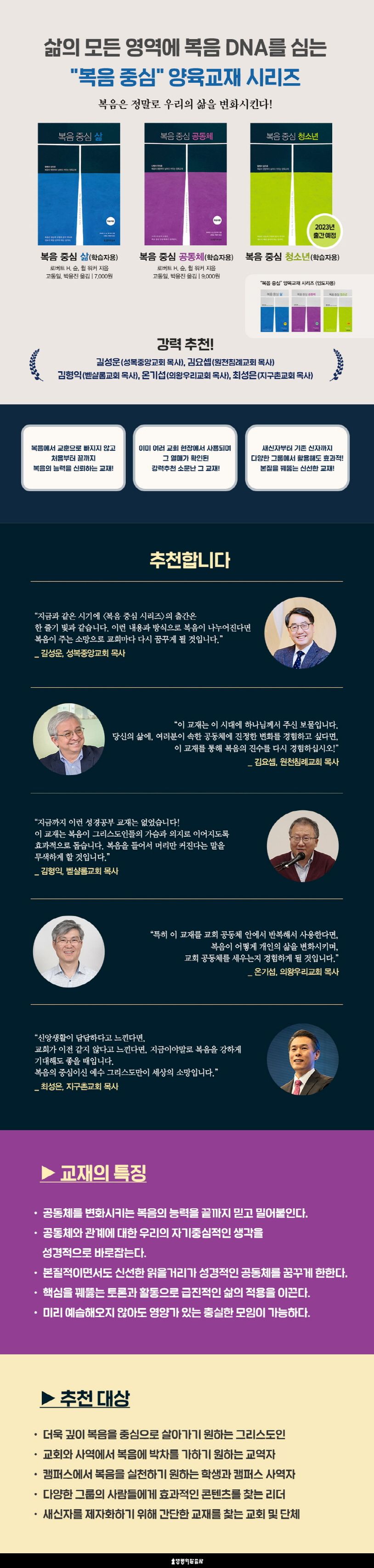 『복음 중심 공동체』는 우리를 새롭게 하는 복음의 역동성이 공동체 생활에 미치는 영향을 소개하기 위해 기획되었다. 모임을 진행하는 데 이 교재 외에 다른 자료는 필요하지 않다. 각 학습자는 반드시 교재를 소지하고 모임에 참여해야 한다. 모임을 마친 후 각자가 삶에서 더 많은 적용을 하게 되겠지만, 보충 수업을 준비할 필요는 없다. 이 과정을 통해 다음의 변화를 소망할 수 있을 것이다.