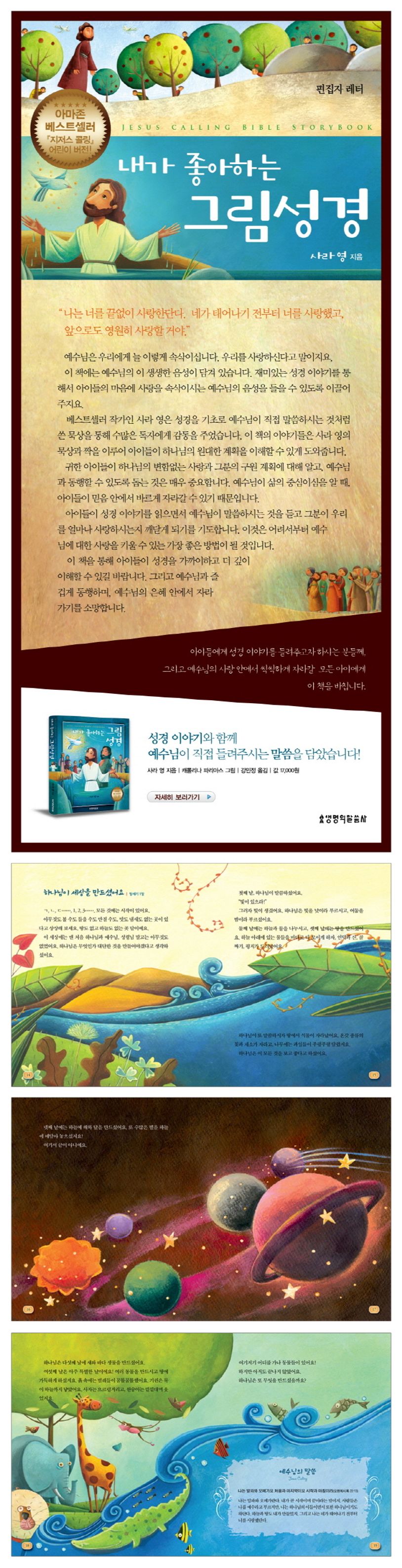 『내가 좋아하는 그림성경』은 사라 영의 베스트셀러 《지저스 콜링》을 어린이 그림성경과 접목시킨 것으로, 수년간의 연구와 기도, 묵상의 기록을 담아낸 책이다. 저자는 예수님의 말씀에 귀 기울고, 자신에게 개인적으로 말씀해 주시는 것이라 생각하는 것을 기록하기 시작했습니다. 예수님의 말씀을 듣는 것은 그 어떤 영적 훈련보다도 예수님과 더 친밀해지도록 도와주었다. 이를 바탕으로 아이들도 예수님과 개인적인 관계를 발전시킬 수 있도록 성경 이야기와 함께 예수님이 직접 들려주시는 말씀을 담았다. 각 이야기마다 이야기와 관련된 예수님의 핵심 메시지를 담아 아이들로 하여금 성경을 더 깊이 이해하고, 예수님의 크신 사랑을 깨닫게 한다.