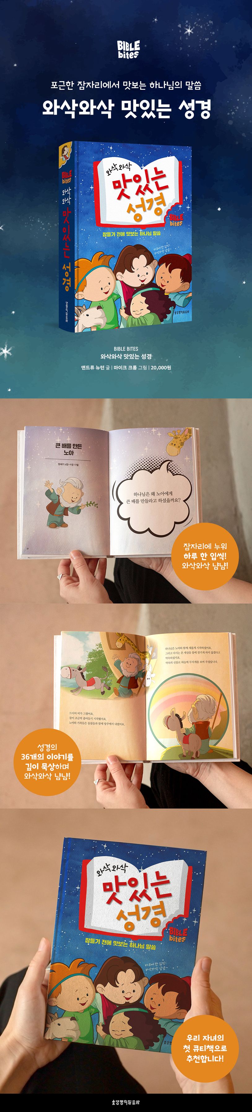 잠자리에서 읽는 성경으로 만들어졌지만, 하루를 시작하는 아침이나 낮잠에 들기 전 등 언제 어디서나 ‘와삭와삭’ 맛있게 먹을 수 있을 것입니다.