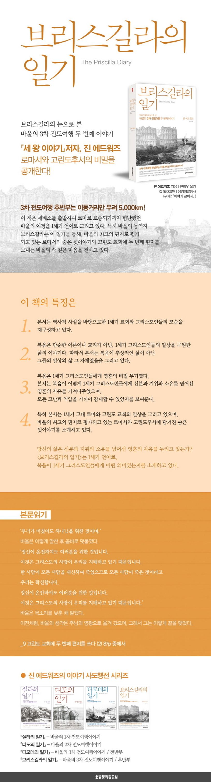 이 책은 에베소를 출발하여 로마로 호송되기까지 험난했던 바울의 여정을 1세기 언어로 그리고 있다. 특히 바울의 동역자 브리스길라는 이 일기를 통해, 바울의 최고의 편지로 평가되고 있는 로마서의 숨은 뒷이야기와 고린도 교회에 두 번째 편지를 보내는 바울의 속 깊은 마음을 전하고 있다.