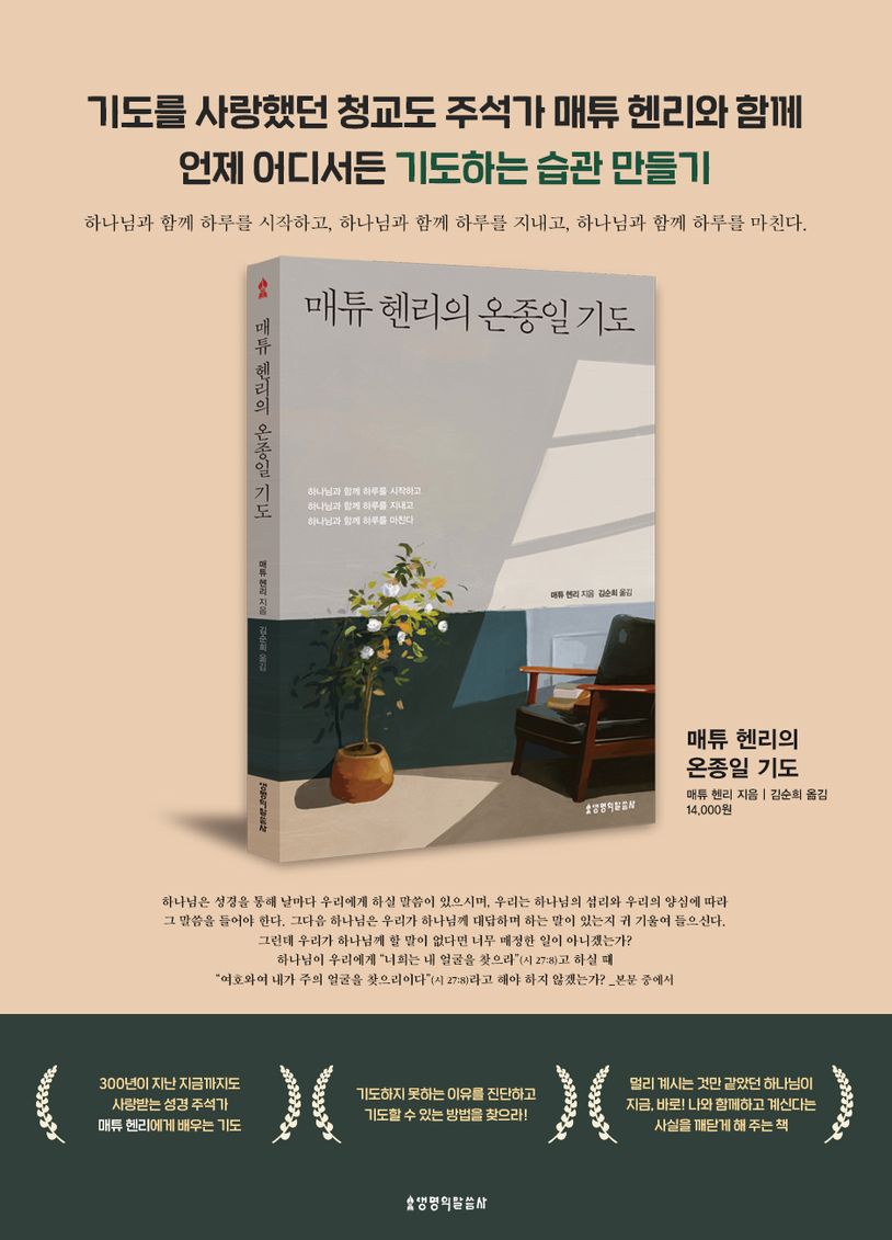 우리가해야하는선한일,기도우리는‘쉬지말고기도하라’는하나님의뜻을알고도종종기도하기를쉬며,‘무엇이든지믿고구하는것은다받으리라’는예수님의말씀을듣고도때때로구하기를망설인다.우리는왜기도해야함을앎에도불구하고기도하지못하는걸까?청교도주석가이자기도를사랑했던매튜헨리는중요하지않은일에는시간을내면서정작기도할시간이없다고변명하고있지않은지돌아보라고권한다.우리는잠을이기지못해아침에기도하지못하고,분주한일상을중요히여기느라낮에도하나님을찾지않고,자신의만족을위하느라잠들때까지도하나님을잊은채살아가고있지않은가?하나님과함께하루를시작하고하나님과함께하루를보내고하나님과함께하루를마친다매튜헨리는경건한다윗을예로들어하나님께온종일기도하는방법을알려준다.아침에주께기도하고(시5:3),종일주를기다리며(시25:5),평안히눕게해주신하나님께감사하며잠을청했던(시4:8)다윗처럼언제어디서나하나님과교제하는방법이다.아침에기도를빠뜨리지않는방법을소개하고,하나님을기다린다는것은어떤의미인지,하나님을기다려야하는이유가무엇인지설명하며우리가온종일하나님을바라볼수있도록도와준다.그리고구체적인상황에서하나님께어떻게기도해야하는지도일러준다.아침에가족을마주할때,자녀들을교육할때,일터에서주어진일을할때,책을읽을때,친구를만날때,여행을할때,잠자리에들때등다양한환경에서하나님을의지하는방법을살펴볼수있다.나와함께하고계신하나님을깨닫고싶다면,임마누엘의하나님을풍성히누리고싶다면,매튜헨리의안내를따라온종일기도하는습관을들여보자.나를주목하고계시는하나님과친밀히동행하는하루를보내게될것이며,잠을자는순간까지도평안을만끽하게될것이다.▶추천합니다!*세상을혼자살아가고있다고생각하는외로운성도*막막한상황에서하나님을바라보길원하는성도*하나님께기도하는방법을자세히알고싶은성도*하나님과더깊이,더뜨겁게교제하고싶은성도*온종일나와함께하시는하나님을깨닫길원하는성도