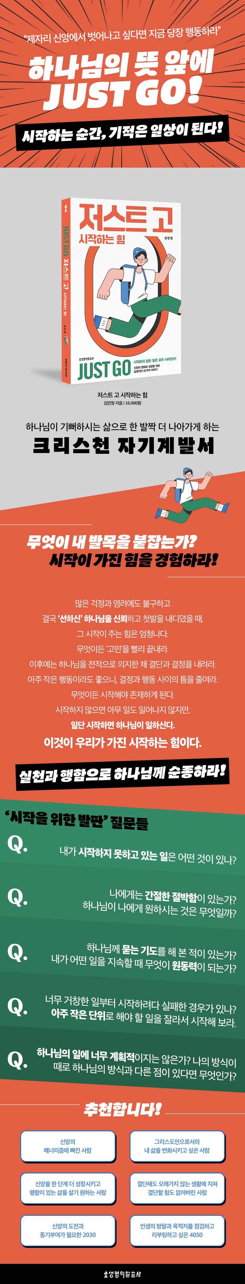 이 책은 변화와 성장을 갈망하는 이들에게 왜 실천과 행함으로 순종해야 하는지 동기를 부여하고, 시작할 수 있는 방법을 제시한다. 작은 것부터 시작해 그것이 생활이 되고 삶이 되는 변화를 만들어 보자. 시작하는 순간 하나님의 놀라운 계획과 기적이 시작된다. 하나님 뜻에 “Just Go” 하기를 원하는가? 그 시작하는 방법을 소개한다.