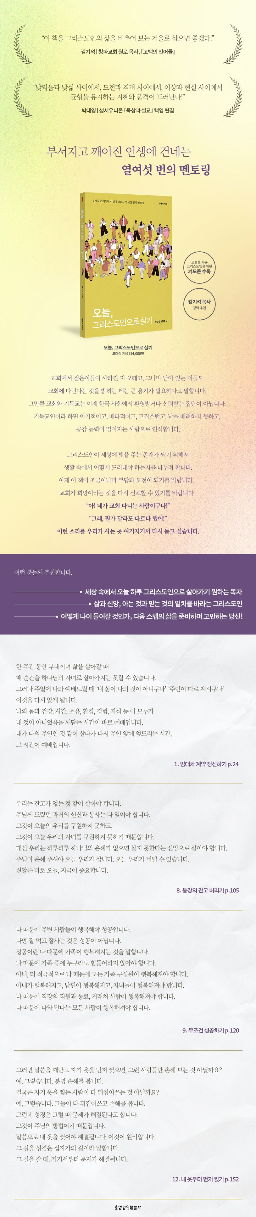무뎌진 우리 생활을 다듬고 벼릴 때다. 늘상 살던 대로 살다가는 그리스도인답게 살아갈 도리가 없다. 관성대로 살던 삶을 뒤흔드는, 이 밀도 높은 멘토링은 그리스도인을 이전과는 다른 삶을 살도록 도닥여 줄 것이다. 어른이 없음을 한탄하는 때에 『오늘, 그리스도인으로 살기』는 그리스도인의 길을 성실히 걸어온 멘토가 다정히 멘토링을 해주듯 의자를 바짝 끌어당겨 우리 옆에 나란히 앉는다. ‘이렇게 살 수 있을까?’ 한 장 한 장 마음을 아릿하게도 하지만 기꺼이 그 자리까지 독자를 초청한다. 그리스도인이라면 오늘, 이 책을 들고 펼쳐야 할 이유다.