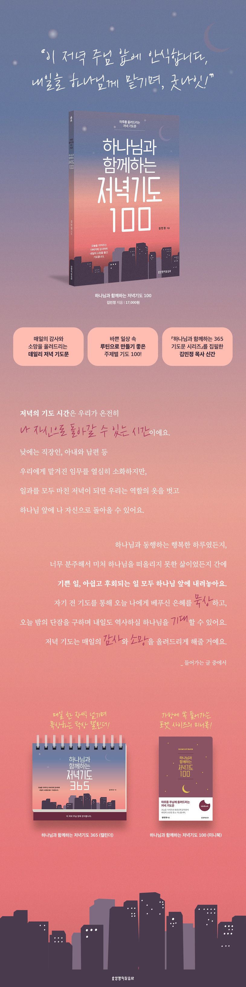 저녁의 기도 시간은 우리가 온전히 나 자신으로 돌아갈 수 있는 시간이다. 낮에는 직장인, 아내와 남편 등 우리에게 맡겨진 임무를 열심히 소화하지만, 일과를 모두 마친 저녁이 되면 우리는 역할의 옷을 벗고 하나님 앞에 나 자신으로 돌아올 수 있다. 『하나님과 함께하는 저녁기도 100』은 하나님과 동행하는 행복한 하루였든지, 너무 분주해서 미처 하나님을 떠올리지 못한 삶이었든지 간에 기쁜 일, 아쉽고 후회되는 일 모두 하나님 앞에 내려놓게 한다. 자기 전 기도를 통해 오늘 나에게 베푸신 은혜를 묵상하고, 오늘 밤의 단잠을 구하며 내일도 역사하실 하나님을 기대할 수 있다. 저녁 기도는 매일의 감사와 소망을 올려드리게 해줄 것이다.
