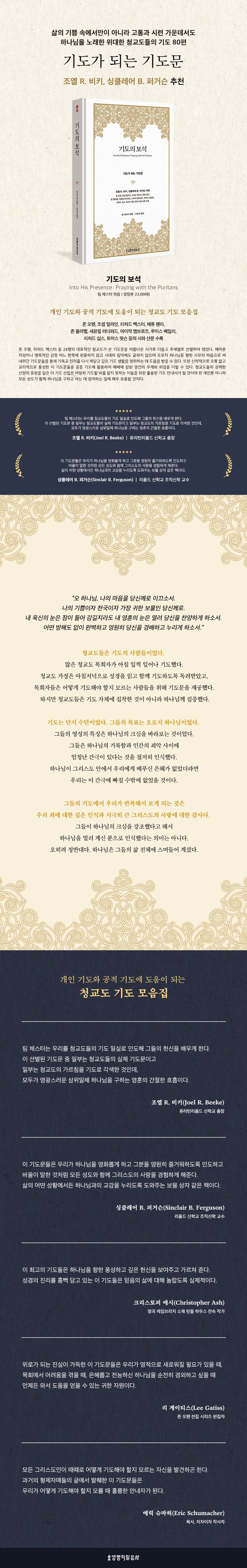 그저 하나님을 영화롭게 하고 그분을 영원히 즐거워하고자 했던 청교도들의 강력한 신앙의 표현을 담은 이 기도 선집은 마땅히 기도할 바를 알지 못하는 이들을 위한 훌륭한 기도 안내서가 될 것이며 한 개인뿐 아니라 모든 성도가 함께 하나님을 구하고 아는 데 참여하는 일에 매우 유용할 것이다.