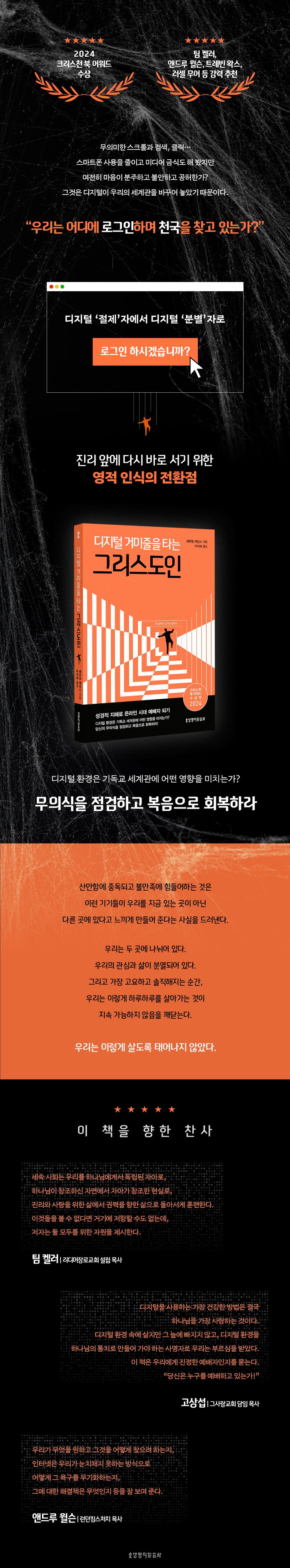 이 책은 단순한 디지털 사용 안내서가 아니다. 단순히 ‘미디어 금식’을 하고 SNS를 지우는 것만으로는 이미 우리 삶 깊숙이 침투한 디지털로부터 완전히 자유로워질 수 없다. 이 책은 신학과 철학, 기독교 세계관을 다양한 예화와 함께 일상 언어로 쉽게 풀어내어 디지털 환경을 살펴보고, 그 환경이 어떻게 우리를 형성하고 있는지를 ‘진정성’과 ‘격분’, ‘수치’, ‘소비’, ‘무의미함’ 다섯 가지 키워드로 설명한다. 특별히 디지털 시대 세계관에 숨겨진 ‘예배의 방향’을 드러내며, 그 속에서 우리가 무엇을 사랑하게 되었는지, 어떻게 복음 중심으로 회복될 수 있는지 안내한다. 이 책은 오늘날 그리스도인이 진리 앞에 다시 바로 서기 위한 영적 인식의 전환점이 되어 줄 것이다. 당신도 이 책을 통해 단지 미디어를 ‘절제’하는 것이 아니라 디지털 환경 자체를 분별하는 자로 변화하게 되길 소망한다.