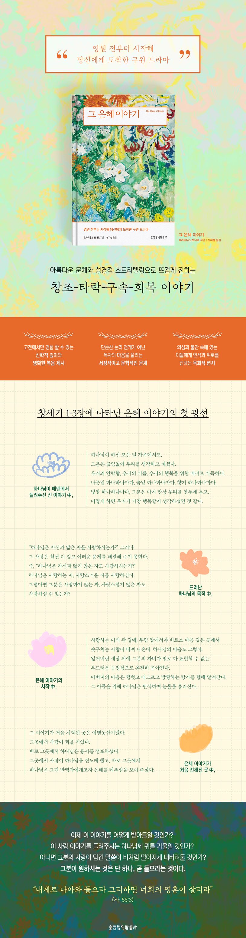 죄가 들어오기 전, 하나님이 지으신 세계는 인간에게 하나님의 선을 이야기했다. 죄가 들어오자, 세계는 하나님의 의를 알리기 시작했다. 그리고 죄가 일어난 바로 그 자리에서 하나님의 은혜 이야기가 시작되었다. 19세기 스코틀랜드 복음주의 부흥운동의 중추였던 호라티우스 보나르는 개혁주의 전통에 따라 기독교의 중심 주제인 창조-타락-구속-회복을 생생한 이야기로 펼쳐 보인다. 성경의 첫 세 장에서 쉽게 이해할 수 없었던 장면들이 사실은 우리를 향한 하나님의 은혜임을 깨닫고 감격하게 될 것이다.