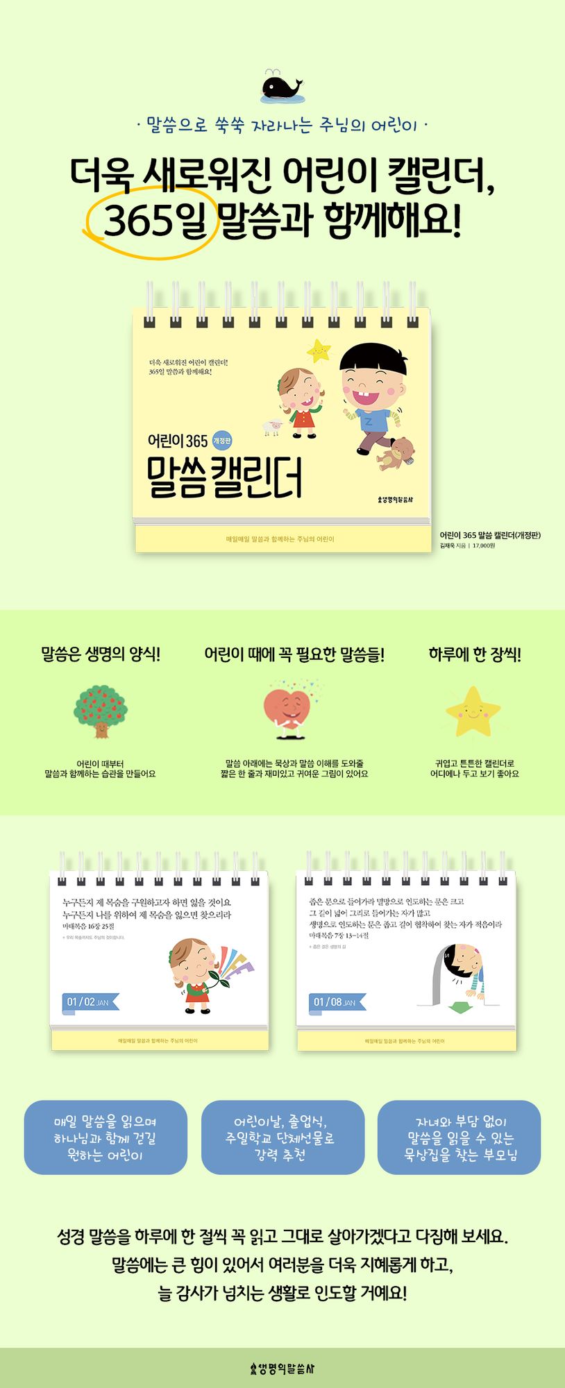 새로워진어린이캘런더로말씀과함께하는매일지혜와키가쑥쑥,사랑스러운주님의어린이가되어요!성경말씀을하루에한절씩꼭읽고그대로살아가겠다고다짐해보세요.말씀에는큰힘이있어서여러분을더욱지혜롭게하고,늘감사가넘치는생활로인도할거예요!★어린이때부터말씀과함께하는습관을만들어요!말씀은생명의양식이에요.또우리삶의길잡이가되지요.그래서우리는언제나말씀과함께해야해요.어린시절부터하나님과동행한사무엘처럼우리친구들도말씀캘린더로365일하나님과함께하길바라요.★쉽고재미있는말씀묵상!어린이때에꼭필요한말씀들을묶었어요.말씀아래에는묵상과말씀이해를도와줄짧은한줄과재미있고귀여운그림이있답니다.우리함께하루에한장씩캘린더를넘기며즐겁게묵상해보아요~★집,독서실,학교등책상위에올려놓고보기좋은사이즈!기존캘린더의단점을보완해서넘기기좋고튼튼하게만들었어요.우리친구들이자주볼수있는자리,침대머리맡이나책상등에올려놓고지나갈때마다말씀을읽고묵상해보아요.여러분의하루가더풍성해질거랍니다!추천합니다!-매일말씀을읽으며하나님과함께걷길원하는어린이-어린이날,졸업식을풍성하게만들어줄의미있는선물-자녀와부담없이말씀을읽을수있는묵상집을찾는부모님