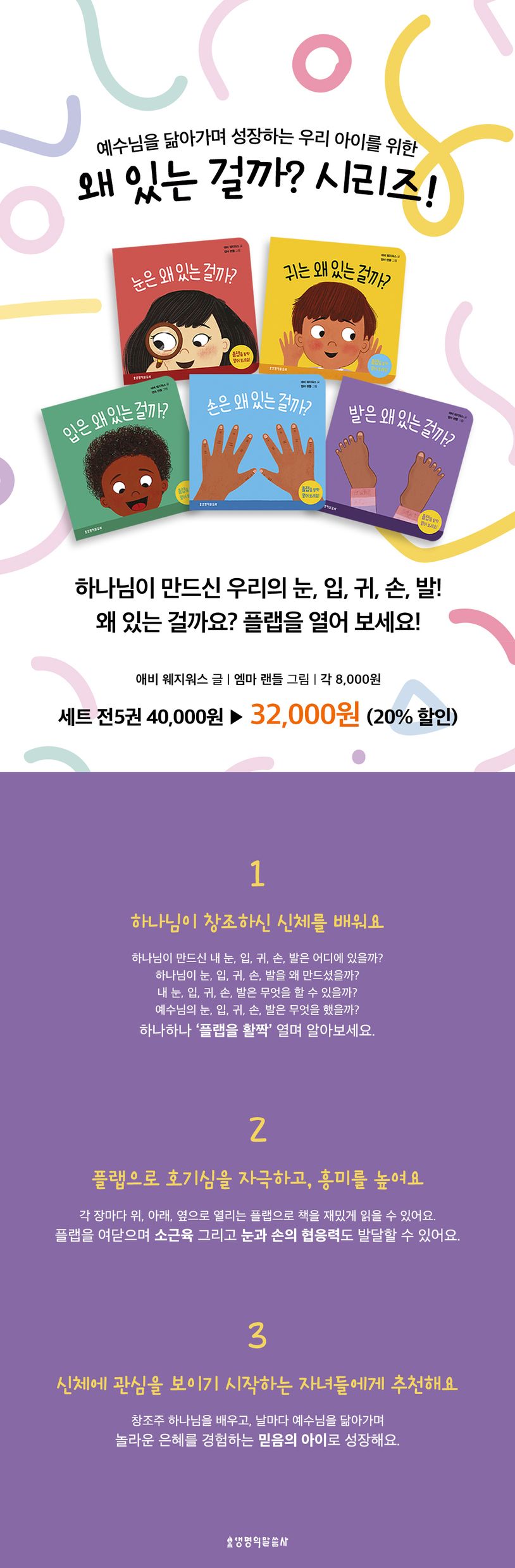 유아기에는 신체와 두뇌 성장이 매우 빠르게 이루어집니다. 자아 개념이 형성될 무렵에는 자기 신체에도 관심이 생깁니다. 눈, 입, 귀, 손, 발 등 자기 신체에 관심이 많아지는 자녀와 함께 이 책을 읽어보세요. 하나님이 창조하신 신체의 부분과 그 기능에 대해 알아갈 수 있습니다. 또한 ‘나와 같은 어린이’였던 예수님의 모습을 닮아가도록 도와줄 수 있습니다.