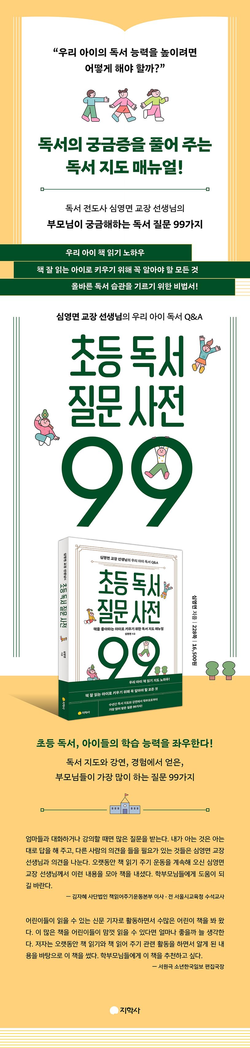 많은부모님과선생님이이론편인『초등독서의힘』과실전편인『초등독서질문사전99』를읽고,아이들을독서의세계로이끌어주었으면하는바람이다.이책의저자인심영면교장선생님은이를위해지금도학교현장에서‘책읽어주기’운동을활발히펼치고있다.