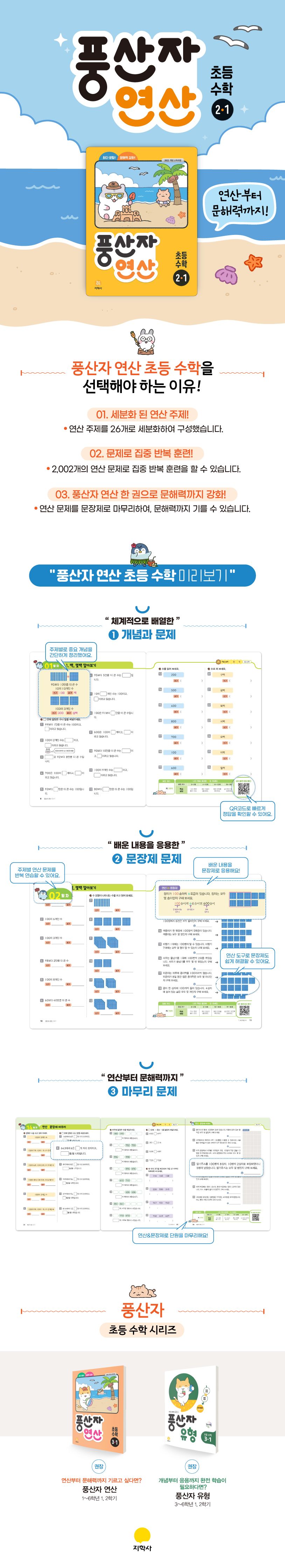‘풍산자 연산 초등 수학 2-1’은 초등학교 수학에서 가장 기본이 되는 연산을 집중 반복 훈련하여 기본기를 다질 수 있는 연산서입니다. 간단한 개념 설명과 연산 문제로 연산의 원리를 파악하고, 연산이 문장제에 어떻게 응용되는지를 살펴볼 수 있도록 구성하였습니다.