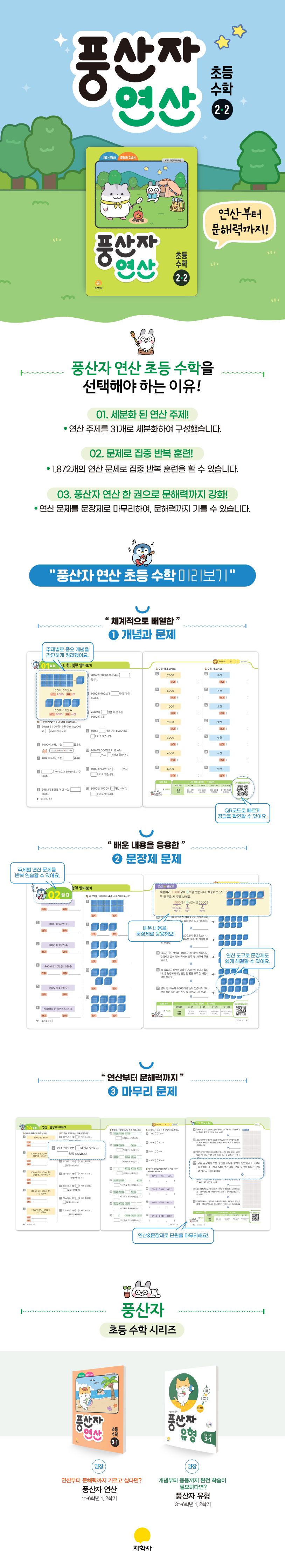 『풍산자 연산 초등 수학 2-2』는 초등학교 수학에서 가장 기본이 되는 연산을 집중 반복 훈련하여 기본기를 다질 수 있는 연산서입니다. 간단한 개념 설명과 연산 문제로 연산의 원리를 파악하고, 연산이 문장제에 어떻게 응용되는지를 살펴볼 수 있도록 구성하였습니다.