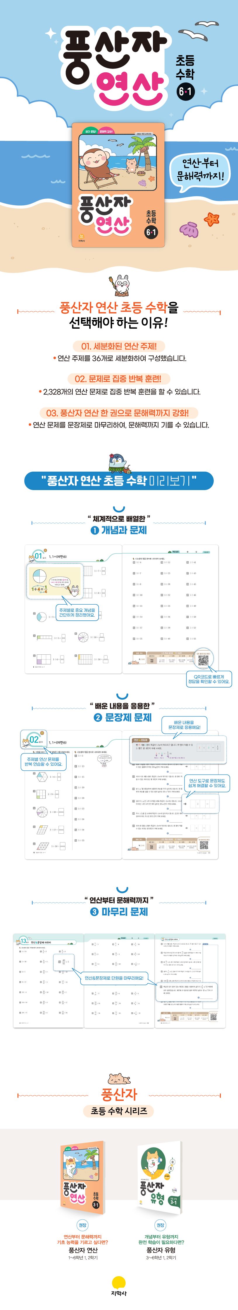 ‘풍산자 연산 초등 수학 6-1’은 초등학교 수학에서 가장 기본이 되는 연산을 집중 반복 훈련하여 기본기를 다질 수 있는 연산서입니다.