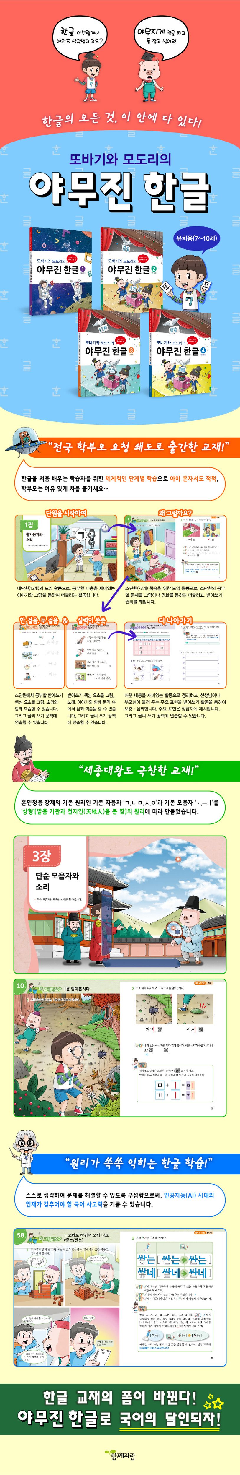 『또바기와 모도리의 야무진 한글』유치용은 ‘4권-15대단원-73소단원’으로 구성되어 있으며 각 소단원은 ‘왜 그럴까요-한걸음, 두걸음, 실력이 쑥쑥-더 나아가기-글씨 쓰기 연습(부록)’으로 심화하였습니다. 한글을 처음 배우는 학습자들이 이 단계를 밟아 가면 한글과 한글 받아쓰기를 쉽게 익힐 수 있습니다. 이뿐만 아니라 각 소단원에서 제시하고 있는 ‘원리’나 ‘규칙’을 이해해 가는 각 과정을 통하여 4차 산업혁면 시대가 요구하는 ‘국어적 사고력’을 기를 수 있습니다. 나아가 초등학교 교과서에 자주 등장하는 기본 어휘를 큐아르(QR) 코드, 소리, 그림, 만화, 놀이, 게임, 노래, 이야기 등을 통하여 쉽게 익혀 초등학교 교과 학습에 필요한 국어 실력을 기를 수 있습니다.
