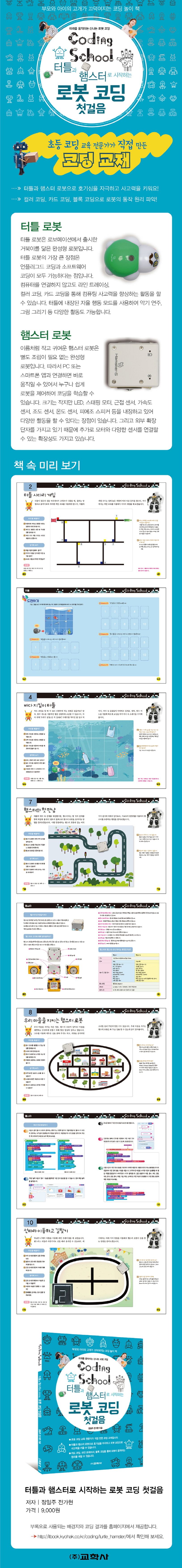 코딩스쿨 시리즈는 처음 코딩을 접하는 학생이 알아야 할 알고리즘부터 기초 프로그래밍, 피지컬 컴퓨팅을 거쳐 인공지능 교육에 이르기까지 미래 사회에 필요하다고 생각되는 컴퓨팅 사고력과 문제 해결력, 인공지능 소양을 키우고자 기획되었습니다. 코딩스쿨 〈터틀과 햄스터로 시작하는 로봇 코딩 첫걸음〉은 여러 가지 코딩 방법을 통해 로봇의 움직임이나 결과를 표현하는 형태로 구성되어 있습니다. 햄스터와 터틀과 같이 작은 로봇을 직접 만져 보고, 코딩을 통해 움직여 보면서 시행착오를 겪으면서 문제를 해결하는 경험을 통해 아이들의 호기심을 자극하도록 만들어진 교재입니다.