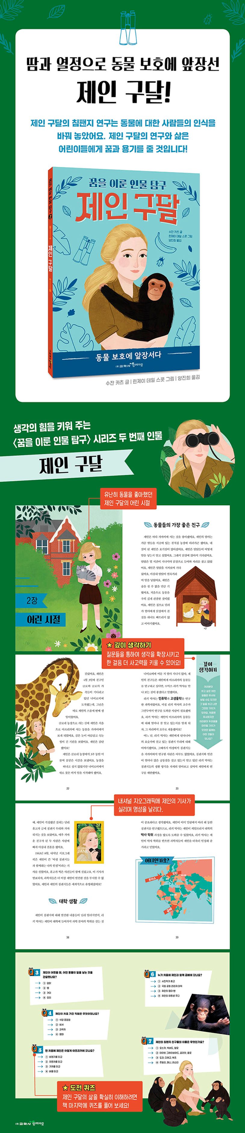책의 뒷부분에는 ‘낱말 풀이’와 ‘도전 퀴즈’를 배치하여 심화 단어와 용어를 알게 하고, 제인 구달이 어떻게 살아왔는지 이해하고 정리해 볼 수 있게 했다. 제인 구달은 여성에게는 좀체 기회를 허락하지 않던 과학계에서 자신만의 독보적인 연구 업적을 쌓음으로써 ‘여자는 안 돼.’라는 당시 사람들의 편견을 깬 사람이다. 요즘은 동물 연구를 하는 과학자가 여성이라는 사실이 놀라운 일이 아니지만 제인 구달이 연구를 시작했던 1960년대에는 극히 드문 일 중 하나였다. 척박한 사회적 환경 속에서도 꿈을 이루겠다는 열정과 의지로 꿈을 이루어 낸 제인 구달의 삶을 들여다보면 ‘포기’가 최선의 선택이 될 수 없음을 깨닫게 된다.