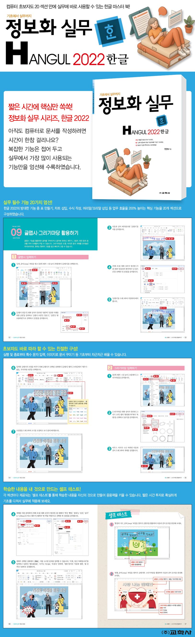 ‘정보화 실무 시리즈’는 컴퓨터에 익숙하지 않은 분들을 위한 교재로, 짧은 시간에 컴퓨터 기초를 다져서 실무에 활용할 수 있도록 기본적인 내용과 필수적인 기능만을 엄선하여 수록하였습니다. 총 20개의 섹션을 통해 ‘한글 2022’의 기능을 학습하고, 각 섹션마다 제공되는 ‘셀프 테스트’를 통해 학습한 내용을 자신의 것으로 만들어 실무에서 바로 활용할 수 있습니다.