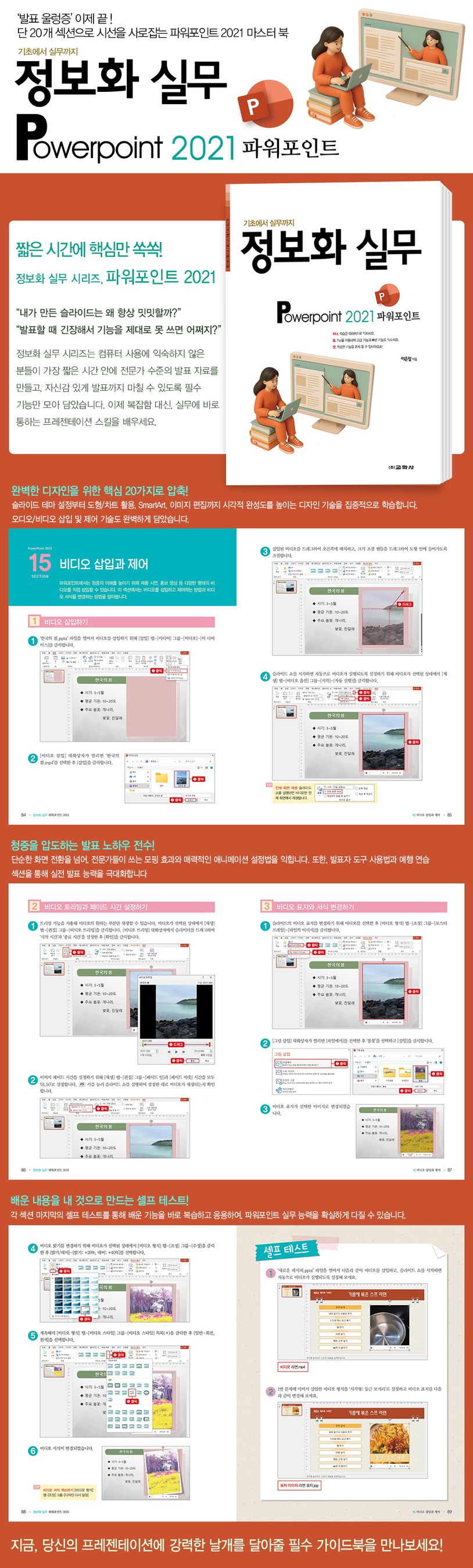 ‘정보화 실무 시리즈’는 컴퓨터에 익숙하지 않은 분들을 위한 교재로, 짧은 시간에 컴퓨터 기초를 다져서 실무에 활용할 수 있도록 기본적인 내용과 필수적인 기능만을 엄선하여 수록하였습니다. 총 20개의 섹션을 통해 ‘파워포인트 2021’의 기능을 학습하고, 각 섹션마다 제공되는 ‘셀프 테스트’를 통해 학습한 내용을 자신의 것으로 만들어 실무에서 바로 활용할 수 있습니다.