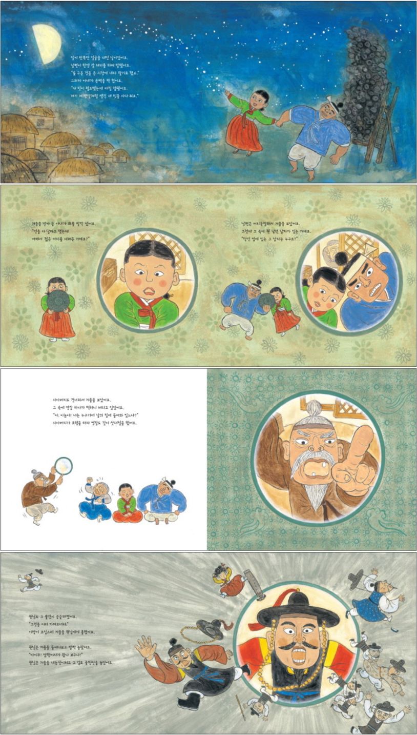 다행히 숯은 전부 팔렸어요. 보름달이 떠올랐을 때 집으로 돌아갈 수 있었어요. 하지만 남편은 아내가 빗을 사다달라고 한 것을 잊어버렸지 뭐예요. 결국 보름달처럼 생긴 거울을 사들고 집으로 돌아갔어요. 거울에 얼굴을 비춰 볼 수 있다는 것은 꿈에도 몰랐어요. 집으로 돌아와 아내에게 거울을 주었어요. 그러자 아내가 "어째서 젊은 여자가를 데려온 거예요?"라고 외치며 화를 냈는데……. 양장본.