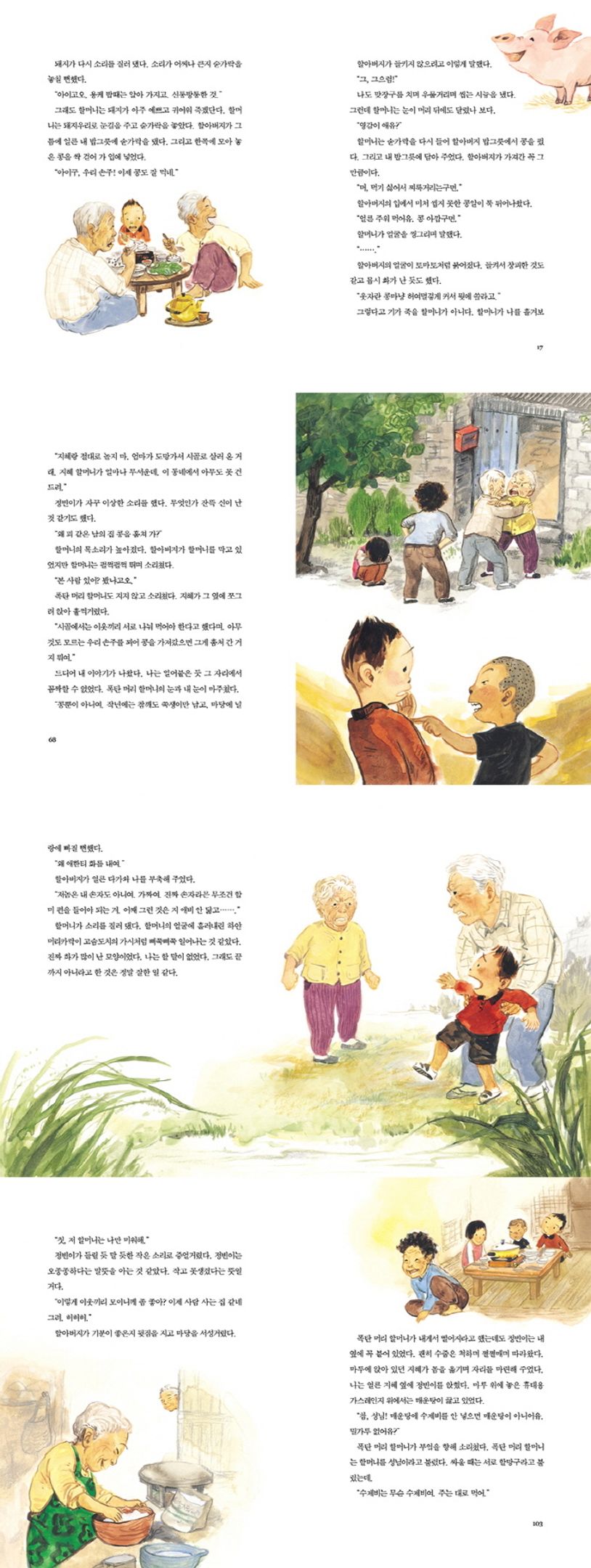 [까만 콩에 염소 똥 섞기]는 핵가족이 늘어나면서 할머니, 할아버지와의 소통이 적은 요즘 가족의 모습을 주인공 바로와 할머니의 이야기를 통해 들려줍니다. 여름방학이 시작하고, 출장 가는 엄마 아빠 대신 이모가 바로를 돌봐 주겠다고 합니다. 유명한 원어민 선생님께 과외를 부탁했다고 신이 난 엄마와 이모. 영어 과외라니, 바로는 생각만 해도 끔찍합니다. 그때 바로를 시골로 데려가겠다며 할머니가 찾아왔습니다. 영어 과외를 받는 것보단 시골로 가는 것이 낫겠다 생각한 바로는 엄마의 눈총에도 모르는 척 시골로 향합니다. 과연 바로는 시골에서 할머니와 사이좋게 지낼 수 있을까요?