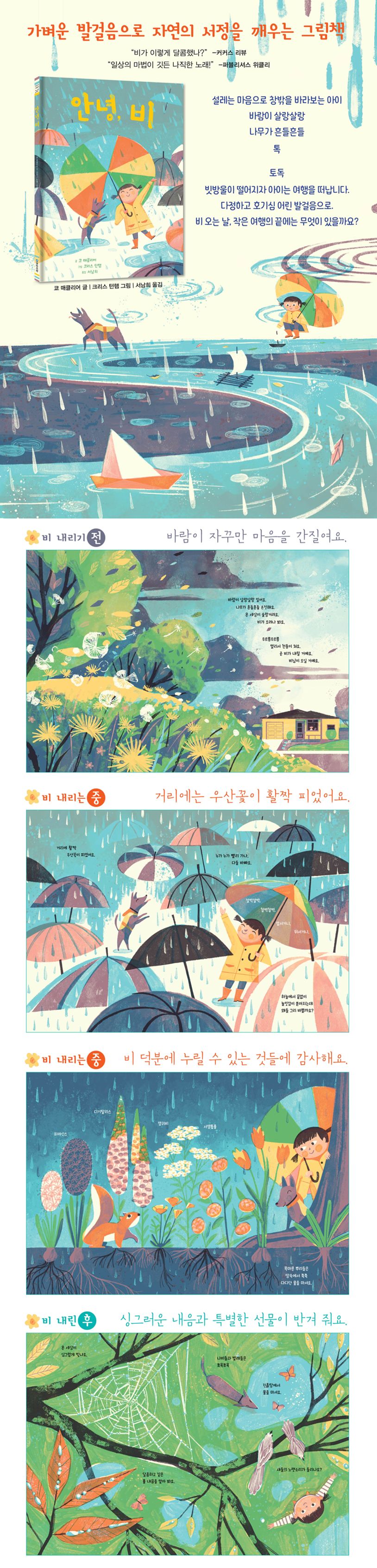 톡 토독 빗방울이 떨어지자 아이는 비옷을 입고 여행을 떠납니다.