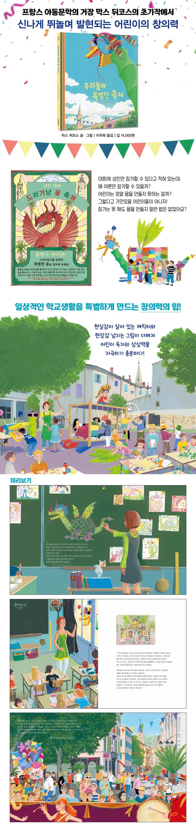 학교에서 선생님이 포스터 하나를 보여 주었어요. 시장님이 주최하는 경진 대회 포스터였지요. 경진 대회에서 우승한 용은 박물관에 전시되고 드라기냥의 상징이 될 거래요. 아쉽게도 성인만 참가할 수 있대요. 그래도 선생님은 이번 기회에 우리도 용을 만들어 보자고 말씀하셨어요. 맞아요! 대회에 참가는 못 해도, 용을 만들 수는 있잖아요. 반 아이들은 선생님과 함께 금요일마다 용을 만들기 시작했어요. 집에서 가져온 물건들을 조립하고 자르고 붙이고 꿰매고 그림을 그리고 색칠하고 장식하고 손질해서 마침내 훌륭한 용을 만들었어요. 대회에 나오는 용들만큼 멋지지는 않을지 몰라도, 어쨌든 우리들의 용이었어요! 대회에 우리들의 용보다 더 멋진 용이 나올까요? 과연 어떤 용이 상을 받게 될까요?