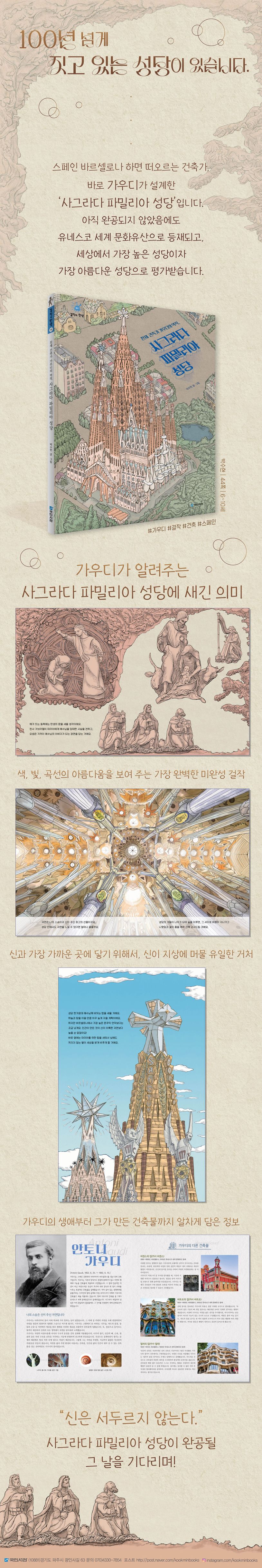 100년이 넘도록 짓고 있는 성당이 있습니다. 바로 스페인 바르셀로나에 있는 ‘사그라다 파밀리아 성당’입니다. 성당은 스페인의 대표 건축가인 안토니 가우디가 설계를 맡았습니다. 그는 성당의 설계와 건축에 자신의 인생을 전부 바쳤지요. 비록 자신의 손으로 완성하지는 못했지만, 후대 건축가들이 가우디의 설계를 바탕으로 성당을 짓고 있습니다. 《천재 건축가 가우디의 역작, 사그라다 파밀리아 성당》은 가우디의 입장에서 써 내려간 그림책입니다. 가우디가 생전에 어떤 마음으로 건축에 임했는지, 어떤 의미를 성당에 담고 싶었는지 여실히 드러납니다. 그의 고결한 마음으로 지은 덕분이었을까요. 사그라다 파밀리아 성당은 아직 완공되지 않았음에도 그 진가를 인정받아 세계 문화유산으로 등재되었습니다.