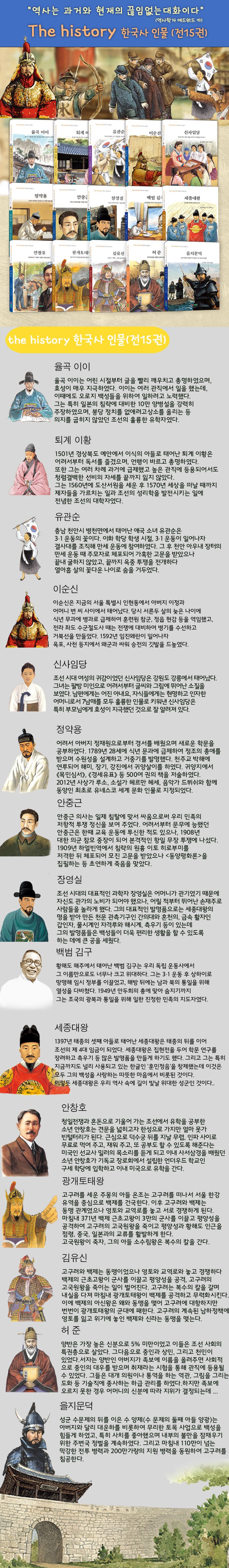 시리즈소개〈THEHISTORY한국사인물15권세트〉는교과서에수록된인물들을중심으로초등학생들이꼭알아야할역사인물을담고있습니다.역사를쉽게배우는방법은역사속에유대한업적을남긴위인을읽으며그시대에대하여자연스럽게배우는방법입니다.또한그인물의어린시절과성장과정,사회와현실에부딪쳐가는모습,자신의꿈이나업적을이루기위해노력하는과정등을살펴보면서꿈을향해노력하고,실패와좌절을겪으면서마침내성공하는이야기를통해도전정신과자신감을키울수있습니다.〈THEHISTORY한국사인물15권세트〉의활용법1.인물의업적과삶을보여주면서관련시대의상황이나역사적배경을파악할수있도록배려했습니다.2.위대한업적이나발명,사상자체를보여주는데그치지않고그것이탄생하기까지의과정을깊이있게서술했습니다.3.역사와현실에대한균형감각을키울수있도록구성했습니다.4.위대한사상가와과학자,종교지도자,예술가,그리고장군과정치인등여러분야의인물을골고루다룸으로써사회에대한폭넓은인식과소양을키울수있도록꾸몄습니다.5.인물의생애와사건을살피는데도움이되는사진자료와내용에따른삽화를적절히실었습니다.6.본문뒤에는연표를요약하여실어줌으로써인물의생애를한눈에살필수있도록구성했습니다.