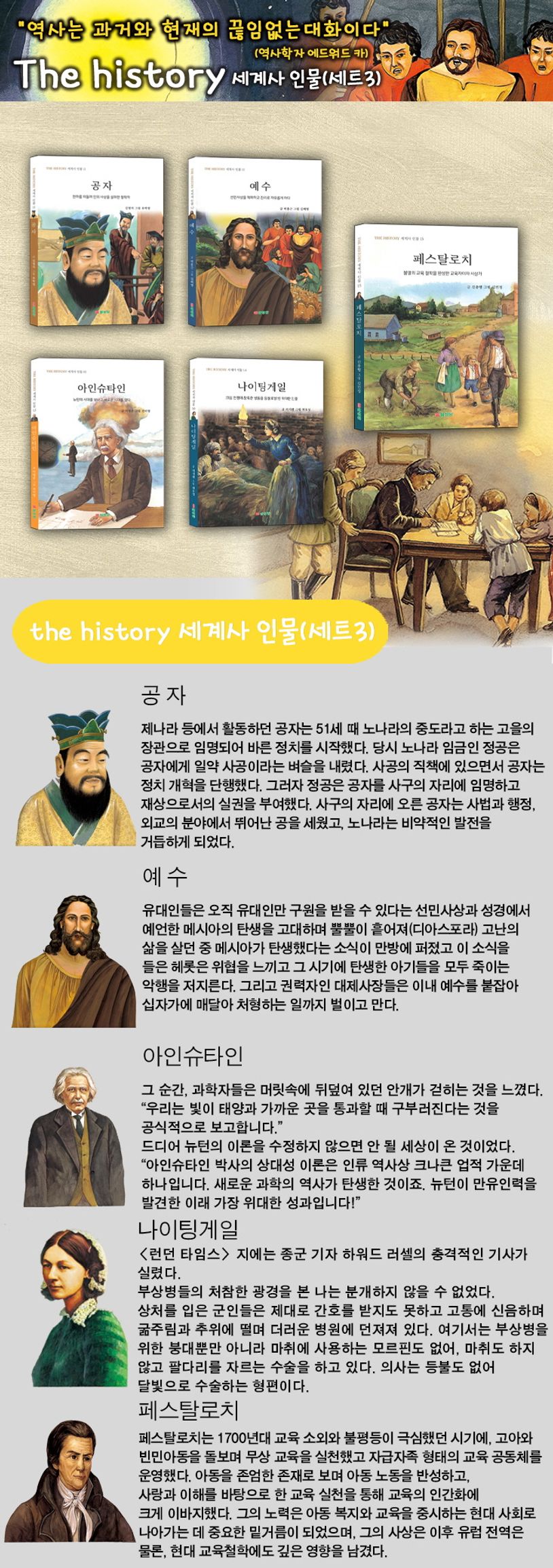 〈THE HISTORY 세계사 인물 세트3〉은 교과서에 수록된 인물들을 중심으로 초등학생들이 꼭 알아야 할 역사 인물을 담고 있습니다. 역사를 쉽게 배우는 방법은 역사 속에 유대한 업적을 남긴 위인을 읽으며 그 시대에 대하여 자연스럽게 배우는 방법입니다. 또한 그 인물의 어린 시절과 성장 과정, 사회와 현실에 부딪쳐 가는 모습, 자신의 꿈이나 업적을 이루기 위해 노력하는 과정 등을 살펴보면서 꿈을 향해 노력하고, 실패와 좌절을 겪으면서 마침내 성공하는 이야기를 통해 도전 정신과 자신감을 키울 수 있습니다.