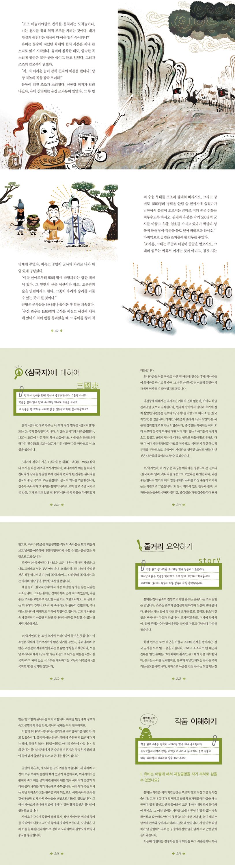 훌륭하고 덕이 높은 한나라의 황족 유비, 출중한 무예와 정의감, 충성심을 가진 장수 관우, 장비, 조자룡, 적장의 속마음을 훤히 꿰뚫어보고 날씨를 예측하며 바람의 방향까지 바꿀 수 있는 책사 제갈공명 그리고 뛰어난 군사 지도자였던 조조 등 중국의 위·촉·오 삼국 시대 영웅들의 활약상을 그린《삼국지》는 어린이들에게 인생을 살아가는 데 필요한 지혜와 참된 용기를 가르쳐 줍니다.