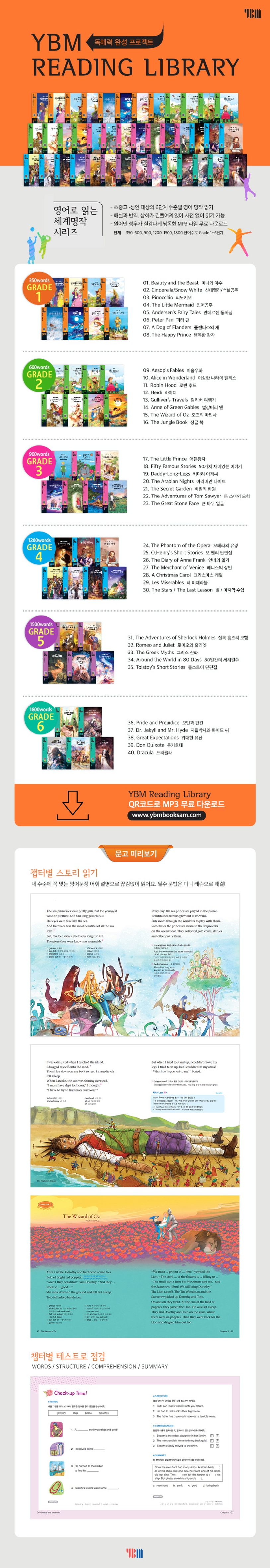 전문 성우들의 박진감 넘치는 목소리 연기로 녹음된 MP3 파일이 포함된 영어명작 시리즈 YBM Reading Library. 보고, 읽고, 동시에 들으면서 리딩, 리스닝 실력을 마음껏 키우세요!