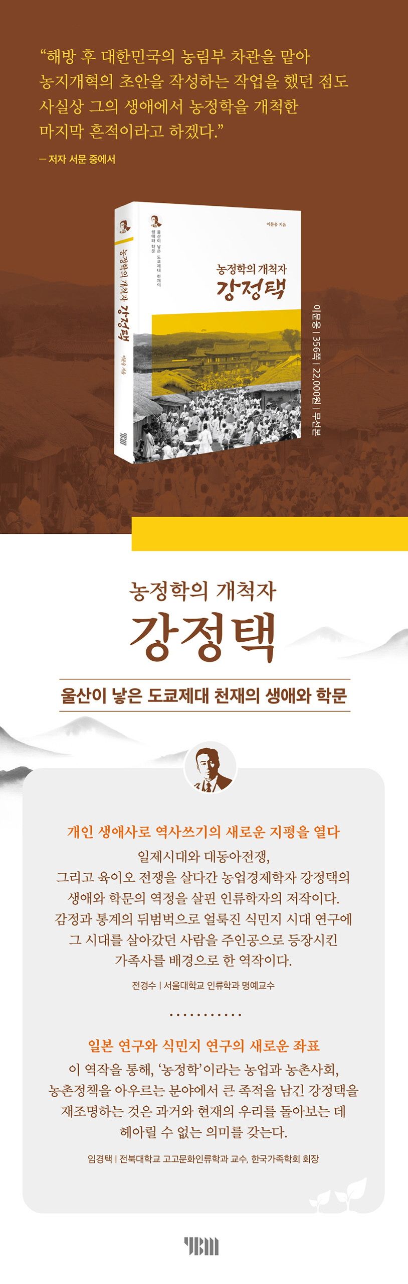 이 책은 강정택 선생의 생애와 학문적 업적을 다룬 증보판 단행본으로, 저자가 2008년에 출간한 강정택 선생의 탄생 100주년 기념 논문집 『식민지 조선의 농촌사회와 농업경제』을 기반으로 한다. 2008년판 논문집이 강정택 선생이 일본어로만 발표했던 논문들을 한글로 번역하고, 이를 중점적으로 다룬 반면, 이 책은 강정택 선생의 드라마틱한 삶과 학문적 연구 활동을 심층적으로 조명한다. 특히 대한민국 농지개혁에 기여한 그의 역할과 관련된 논란을 재평가하며, 선생이 남긴 유산과 그가 농정학에 끼친 영향을 재조명하는 이 중요한 집필 작업을 통해 저자는 35년여간 선생의 생애와 업적을 뒤쫓아온 자신의 긴 연구 여정을 마무리하고자 한다.
