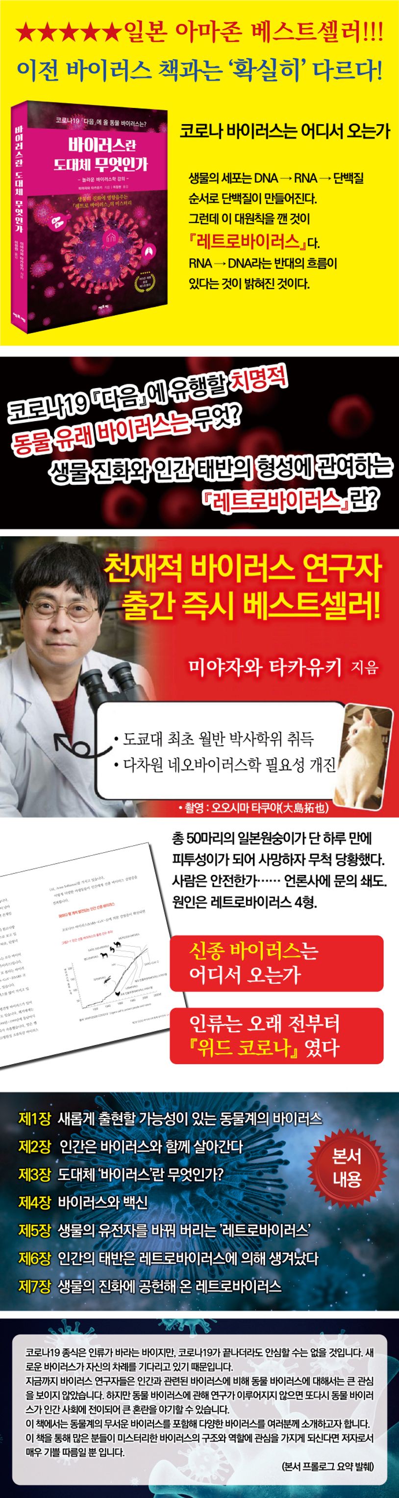 영화 속 좀비 떼처럼 무서운 기세로 창궐하고 있는 코로나19 변이는 앞으로 어떻게 전개될 것인가. 이 책의 저자는 저명한 수의학 박사이자 현재 교토대학 바이러스 재생의학연구소 준교수다. 그는 코로나19 전염병이 퍼진 팬데믹 상황에 대해 사람들에게 닥칠 현실적인 문제들을 가감 없이 설명한다. 레트로바이러스를 중심으로 바이러스 연구에 34년간 종사해 오면서 코로나19 다음으로 새롭게 출현할 동물 바이러스는 무엇이 있는지를 교토대학의 강의를 통해 알기 쉽게 해설해준다. 그리고 바이러스란 도대체 무엇인지, DNA형 바이러스와 RNA형 바이러스, 그리고 mRNA는 어떻게 작동하는지, 사람에게 옮기는 동물계의 무서운 바이러스는 어떤 것이 있는지 등 독자들이 궁금해 할 만 한 내용들을 풍부한 전문지식을 통해 소개한다. 전 세계는 단계적 일상 회복을 통해 ‘위드 코로나(with Corona)’를 시도하지만 강력한 변이 바이러스 오미크론의 출현으로 또 다시 공포에 시달리고 있다. 하지만 이 책에서는 인간은 적어도 52 년 전부터 이미 코로나와 함께 해 왔다고 한다. 심지어 감기 코로나바이러스인 NL63은 훨씬 더 오래된 바이러스로 13세기경에 발생한 것으로 추측된다고 저자는 말한다. 13세기면 중세시대 무렵이다. 언론에서 너무 ‘신종 바이러스’, ‘미지의 바이러스’라고 대대적으로 보도하니까 코로나19 바이러스를 특별한 바이러스라고 착각하기 쉽지만 사실은 그렇게 특별하지 않다는 것이다.