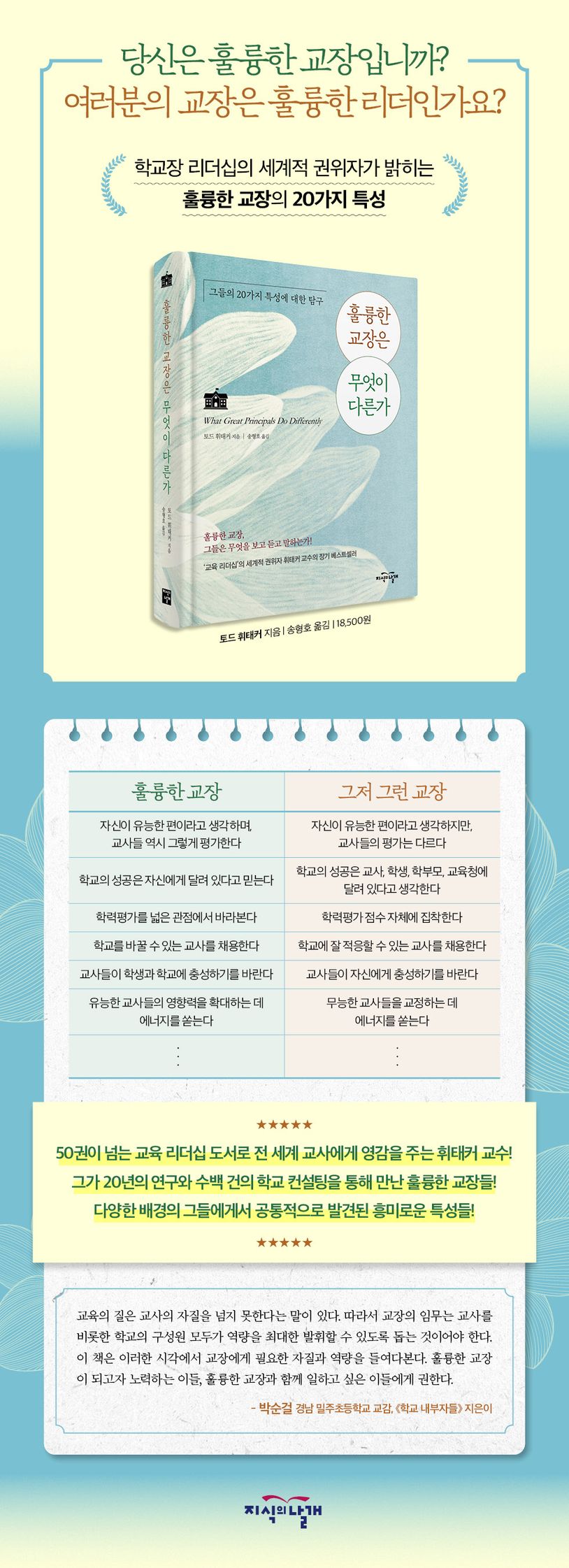교육 리더십 분야의 세계적 권위자이자, 50권이 넘는 저서로 전 세계 교사들에게 깊은 영감을 주고 있는 토드 휘태커 교수의 대표 도서. 2002년 초판 출간 이래 꾸준한 개정과 증보를 거치며 20년째 아마존 베스트셀러로 자리매김하고 있다.