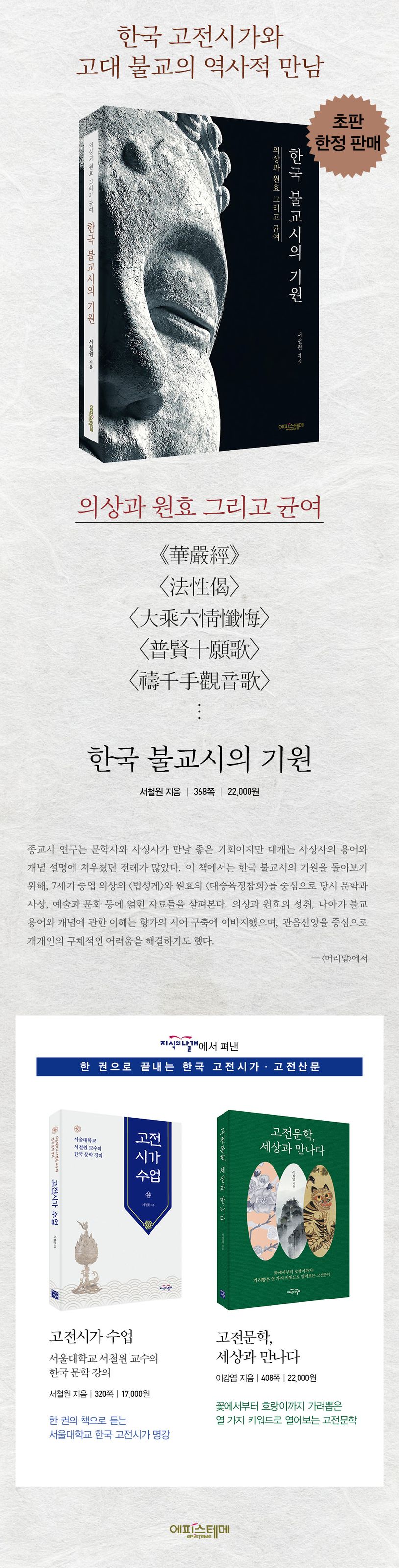 의상과 원효의 성취, 나아가 불교 용어와 개념에 관한 이해는 향가의 시어 구축에 크게 이바지했음은 물론이고, 관음신앙을 중심으로 개개인의 구체적인 어려움을 해결하기도 했다. 이를 밑거름으로 조선시대 이후에는 선불교와 유학의 자연관 등을 공유하며 자연과 인간에 관한 새로운 이해를 도출해 낼 수 있었다. 의상과 원효의 시어는 문학과 사상의 만남으로서 큰 의미를 가진다. 《한국 불교시의 기원》과 함께, 두 대사상가의 신라 초기 게송을 직접 탐구해 봄으로써, 향가와 한국 서정시의 시원(始原)을 향해 나가자.