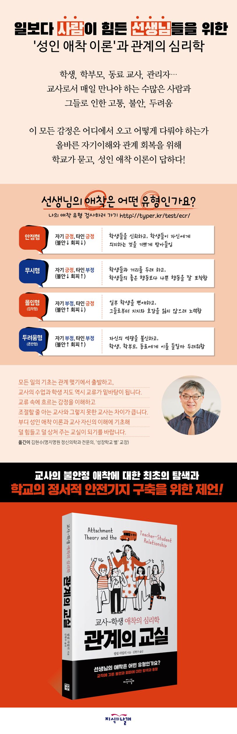 책이 제시하는 해법은 '성인 애착 이론'이다. 모든 인간관계의 기초가 되는 '애착'이라는 개념을 설명하고, 교사 자신의 애착 유형, 즉 타인과 관계를 맺는 방식을 자각하게 함으로써 학생을 비롯한 학교 구성원들과의 관계를 재정립할 수 있도록 돕는다. 또한 학교 차원에서 교사들을 위한 정서적 안전기지를 구축하는 방안을 제시하여 모든 교사가 건강한 안정감 속에서 교직 생활을 영위할 수 있도록 안내한다.