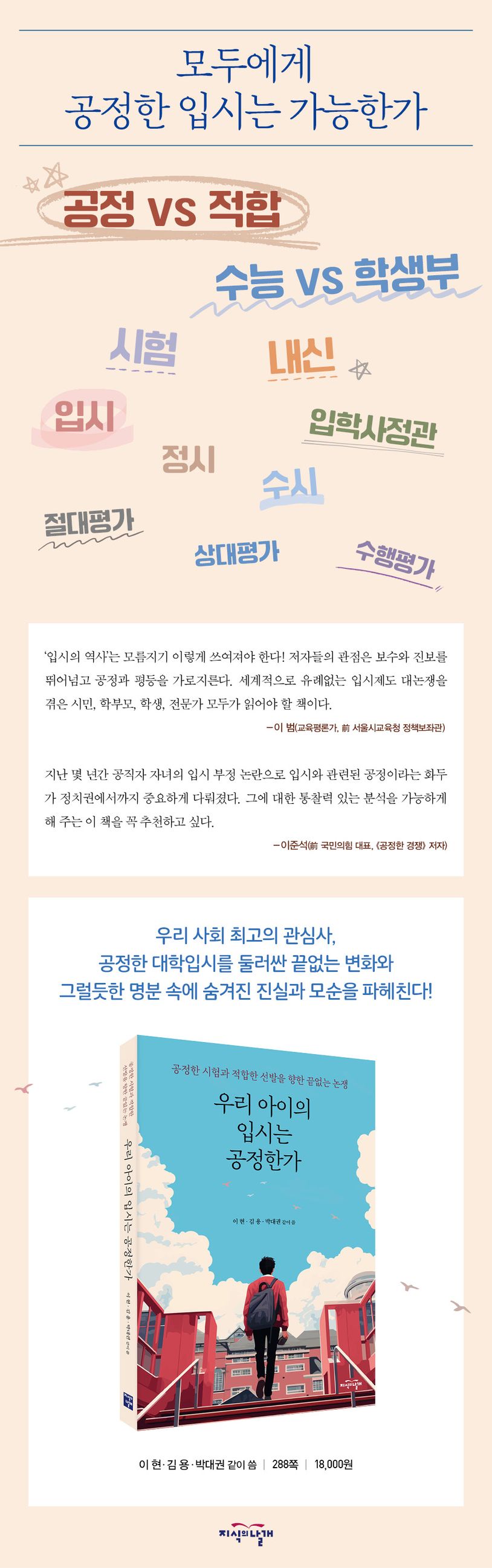 어느 순간부터 ‘공정’이 우리 사회 최고의 지고지선한 가치가 되었다. 지속적인 저성장 속에서 내 몫은 내가 지켜야 한다고 믿는 청년 세대를 중심으로 ‘공정’은 그 무엇으로도 대체 불가능한 우리 사회의 핵심 가치로 급부상했다. 이러한 풍경은 대학입시라고 해서 다르지 않다. 수시모집이 불투명하게 이루어지는 현실 속에서 수험생들은 시험이, 수능이 가장 공정하다고 외치고 있다. 그러나 과연 단 한 번의 시험으로 적재적소에 적합한 인재를 선발할 수 있을까. 세상은 빠르게 변하고 있고, 대학 또한 학생 선발의 자율권을 요구하는 중이다. 그 결과가 바로 지금의 제도로 나타났다. 수능은 정말 공정한 시험일까, 그리고 학생부는 진정 적합한 인재를 선발하는 최적의 통로일까. 세계적으로도 유례없는 입시제도 대논쟁을 겪고 있는 한국의 시민이라면 모두가 반드시 읽어야 할 책이다.