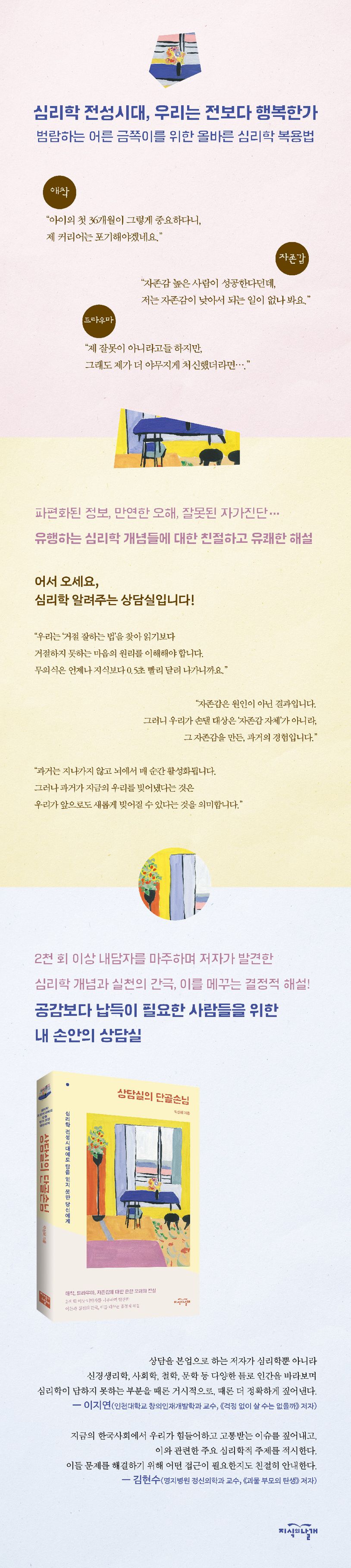 책은 우선 한국사회가 심리학을 받아들이는 특이한 지점들을 규명한다. 그리고 이러한 한국적 맥락에서 무분별하게 퍼져나간 개념들, 즉 애착, 자존감, 트라우마에 대한 흔한 오해를 짚어내고 바로잡는다. 이 과정에서 루이스 코졸리노, 베셀 반 데어 콜크, 스티븐 포지스 등 이 시대의 위대한 학자들이 정립한 최신 뇌과학 이론을 실제 상담사례에 접목하여 우리 삶에 올바르게 적용하는 방법을 안내한다. 상담은 그저 공감과 위로가 아니라고 역설하는 저자의 전문적 해설을 통해 독자들은 심리학과 상담의 개념을 새롭게 이해하게 될 것이다.