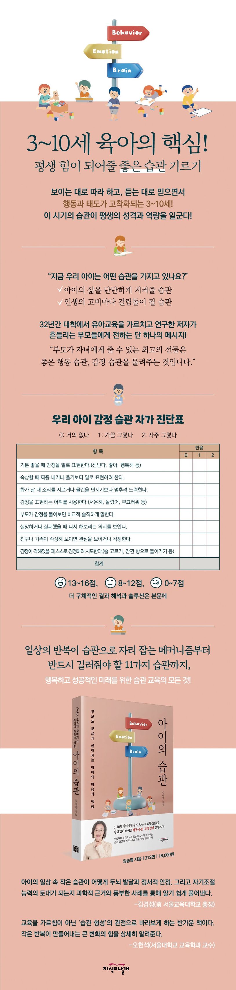 이 책은 부모와 아이가 함께하는 일상의 작은 반복이 어떻게 습관으로 자리 잡는지 뇌과학적 메커니즘을 통해 설명하고 이를 토대로 효과적인 육아 전략을 소개한다. 특히, 겉으로 드러나는 행동뿐 아니라 감정 역시 습관의 영역으로 보고 어릴 때부터 마음 다스리는 법을 훈련해야 한다고 강조한다. 대학에서 30년 넘게 유아교육 전문가를 양성했으며 지금은 유아동 부모를 대상으로 상담, 멘토링, 강연을 이어가는 임승렬 교수가 쉽고 명료한 문체로 대중에게 다가간다.